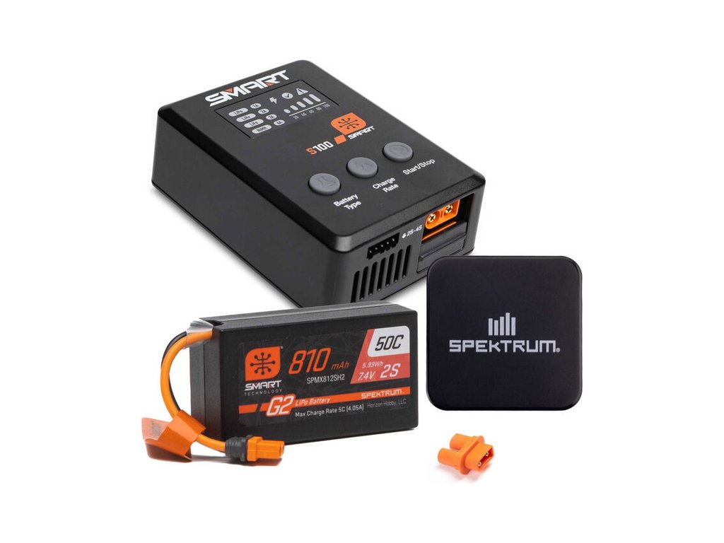 Součástí dodávky je nabíječ Spektrum S100 1x100W USB-C, 60W kabel USB-C, USB-C adaptér, akumulátor Spektrum Smart G2 LiPo 7.4V 810mAh 50C HC IC2, redukci IC2/IC3, návod k použití produktu.
