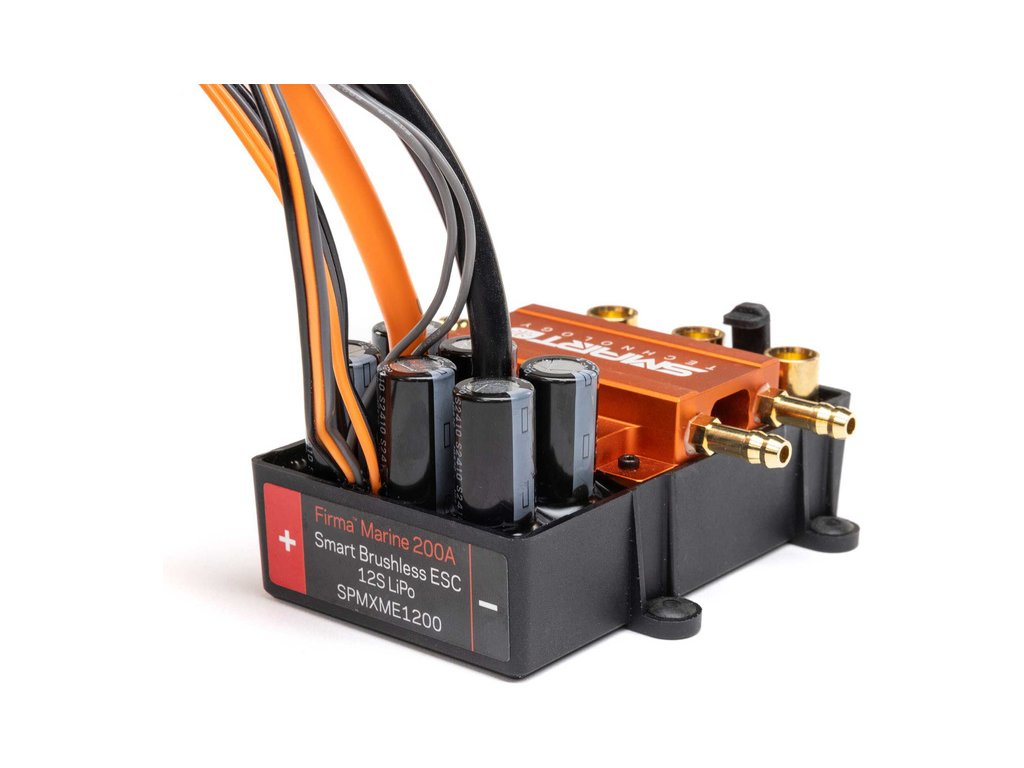 Lodní střídavý regulátor Spektrum Firma 200A Marine, vodou chlazený. Napájení 6-12S LiPo. Spínaný BEC 6-8.4V (továrně 6V), proud 25A. Vypínač s pryžovou krytkou. Duální konektory IC5. Určeno pro obří rychlostní lodě.
