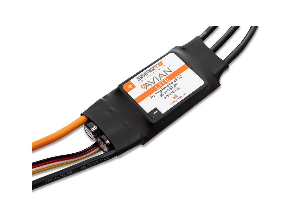 Náhradní díl do RC modelů letadel E-flite Turbo Timber Evolution, Piper Cherokee: Střídavý letecký regulátor Spektrum Avian Lite 70A, napájení 3 až 6 článků LiPo, konektor Spektrum IC3.