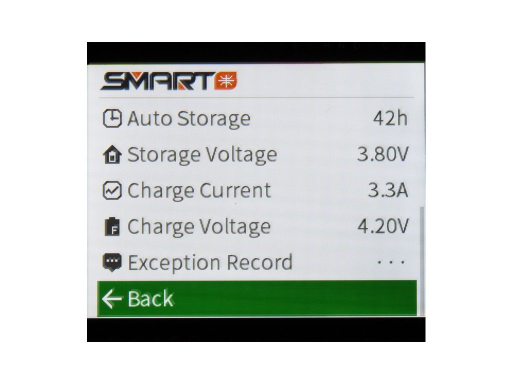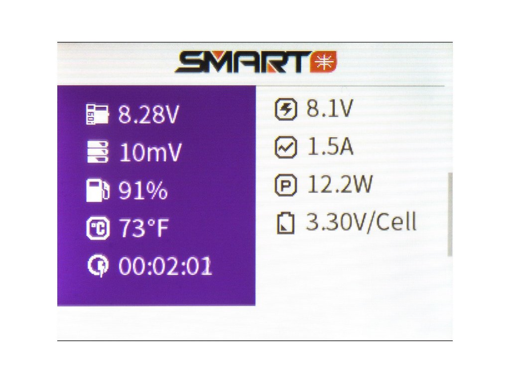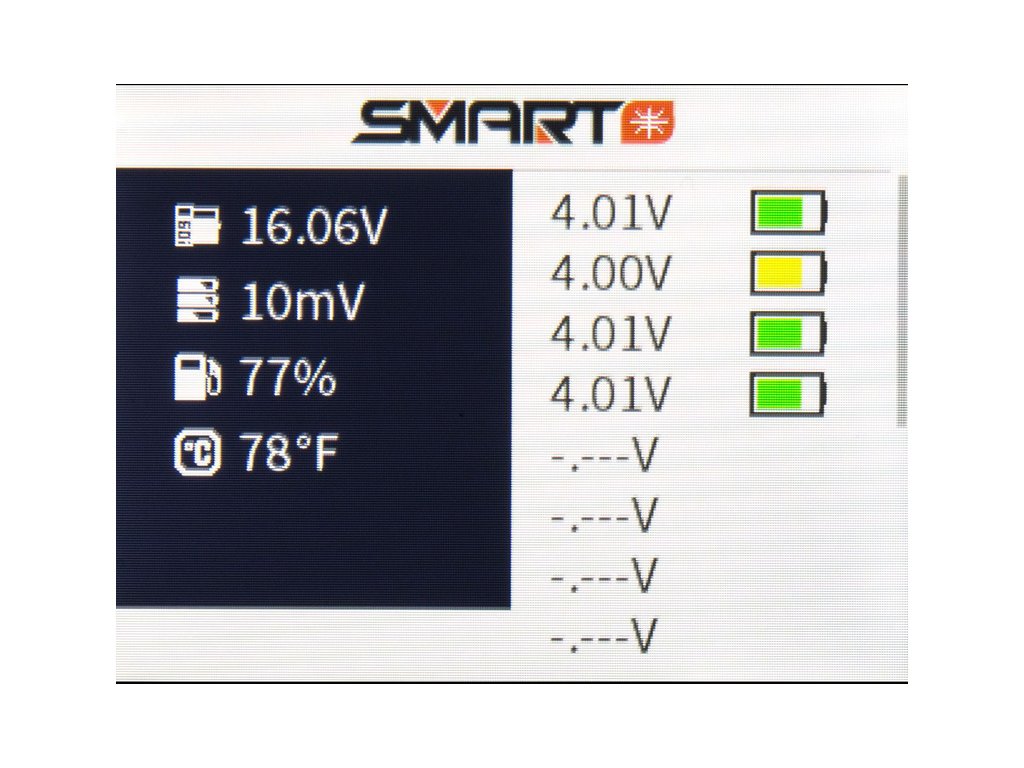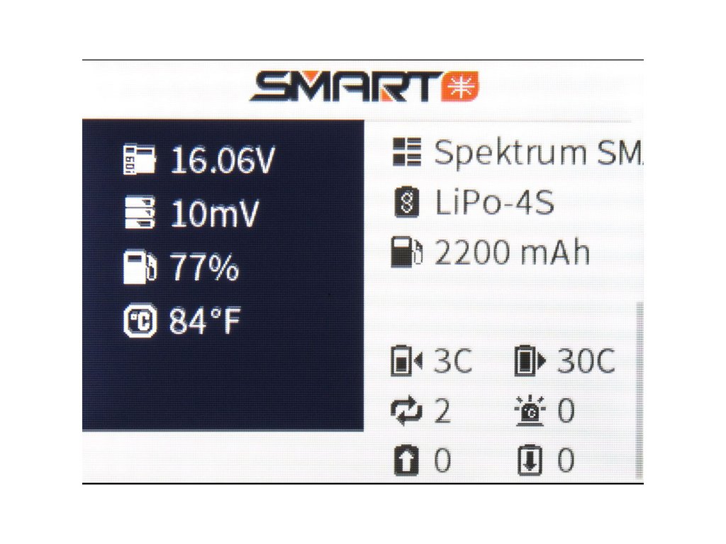 Při použití baterií baterií Spektrum Smart, nabízí přístroj XBC100 Smart kromě informací o stavu článků i historii a to počet proběhlých cyklů a záznam nestandardních hodnot, např. přílišné vybití nebo přebití článků. Vše se zobrazuje na barevném dotykovém LCD displeji IPS, který je snadno čitelný i na přímém slunečním světle.