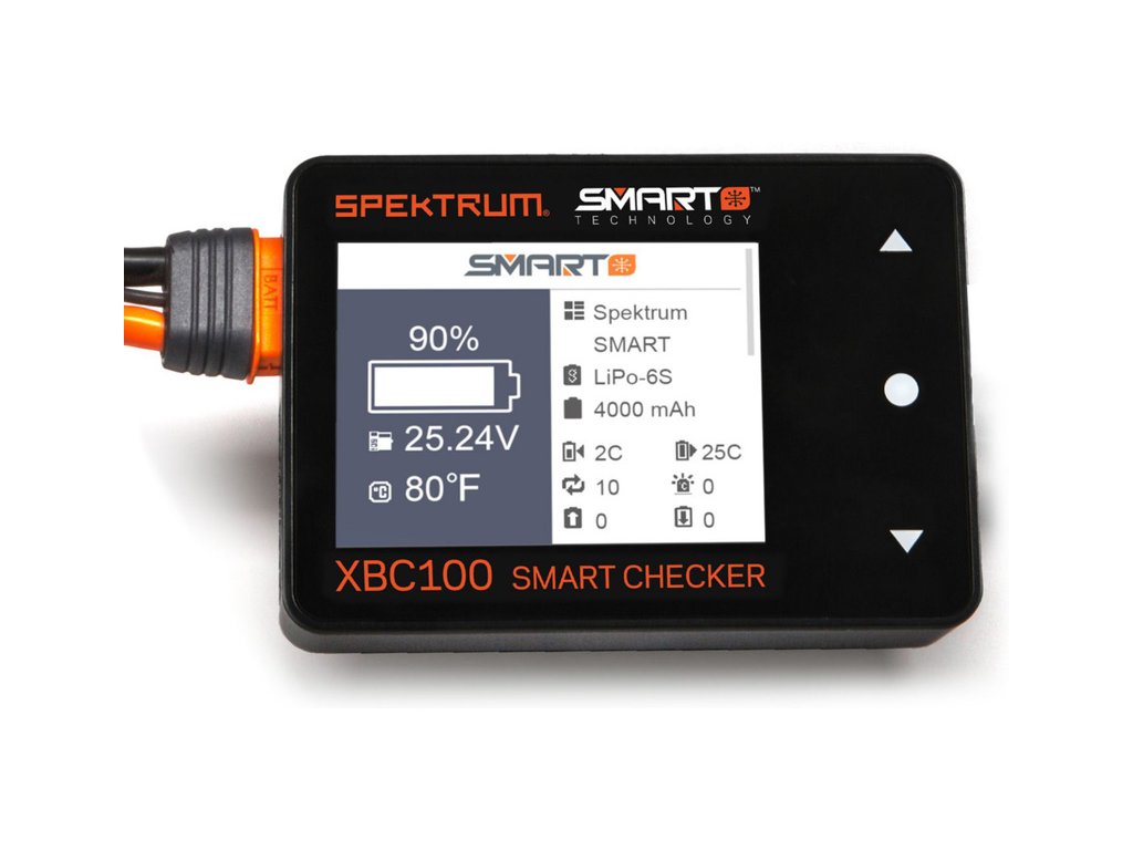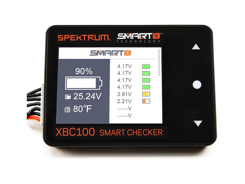 Spektrum XBC100 Smart je užitečný a univerzální pomocník pro kontrolu baterií, měří Lipol, LiHV, LiFe, LiIon, MiMH, NiCd až do celkového napětí 30V. Minimální vstupní napětí je 5V. Připojit lze baterie s konektorem IC3, EC3, nebo servo konektor. Konektor balancéru JST-XH. Po připojení baterie zobrazí napětí jednotlivých článků a stav nabití baterie. Přístroj nabízí pohyb po přehledně uspořádaném menu, na kterém lze volit jednotlivé funkce.