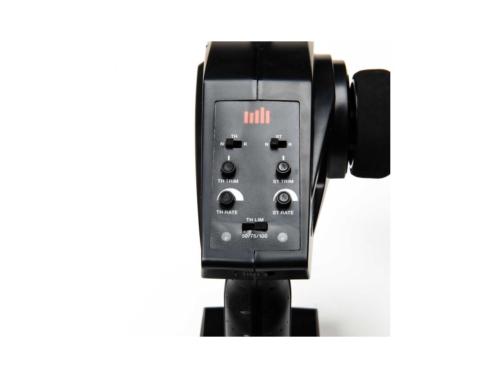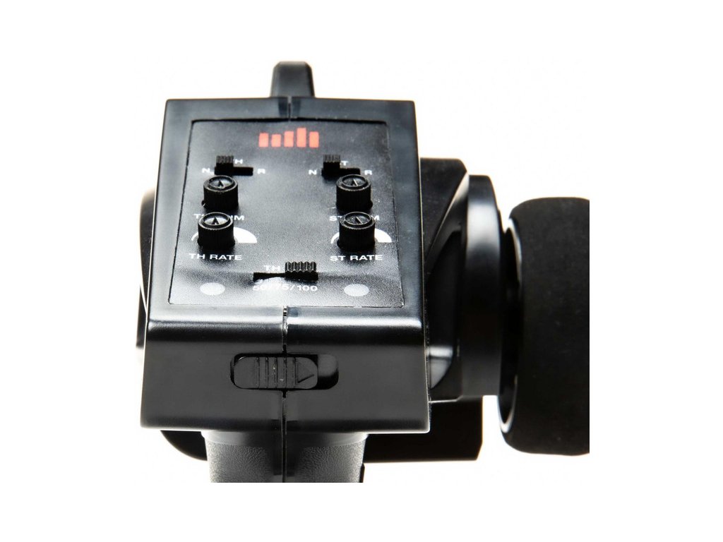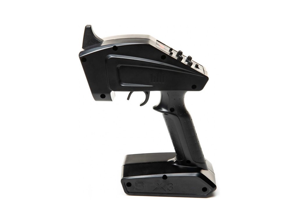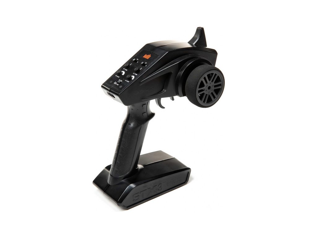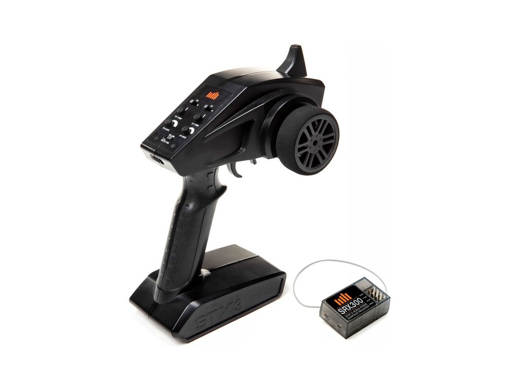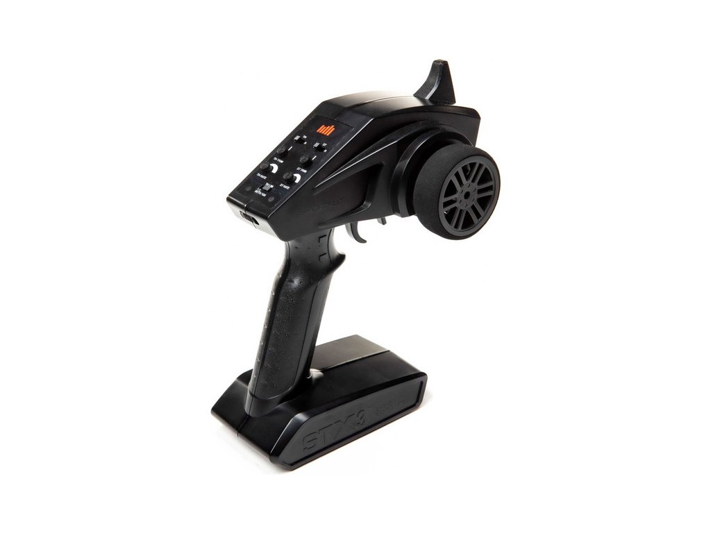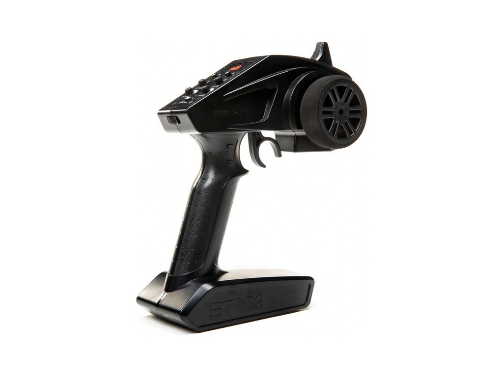 RC vysílač Spektrum STX3 má velmi jednoduché nastavení, vrchní dva přepínače jsou reverzy plynu a řízení, prostřední jsou otočné trimy pro nastavení neutrálu plynu a řízení, pod nimi je nastavení velikosti výchylek plynu a řízení. Spodní přepínač je nastavení omezovače plynu na 50/75/100% (hodnota 50% je vhodná např. pro děti - model pojede poloviční rychlostí).