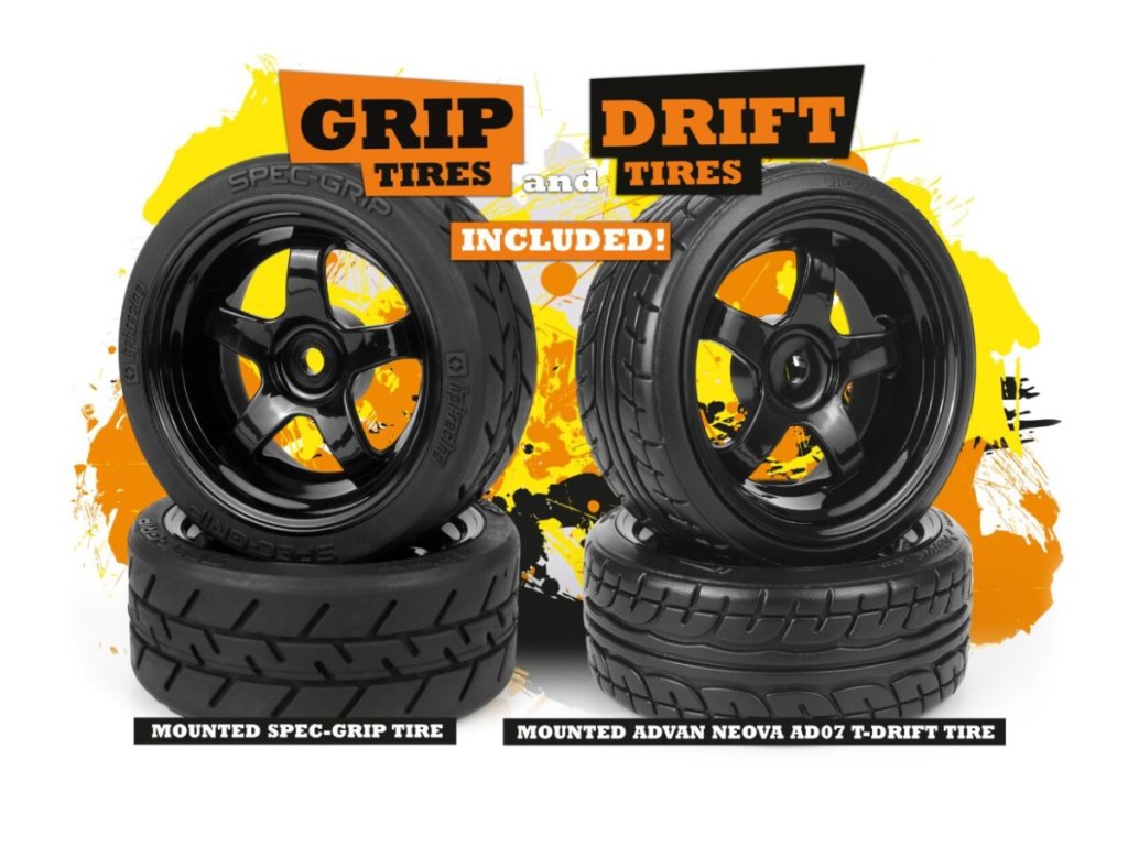 Ani tady jsme se ale nezastavili - součástí balení není jedna, ale DVĚ sady pneumatik, takže si můžete vybrat, zda chcete jezdit driftem, nebo rychlou "přilnavou" jízdou na okruhu či na ulici! Je to zcela na vás!