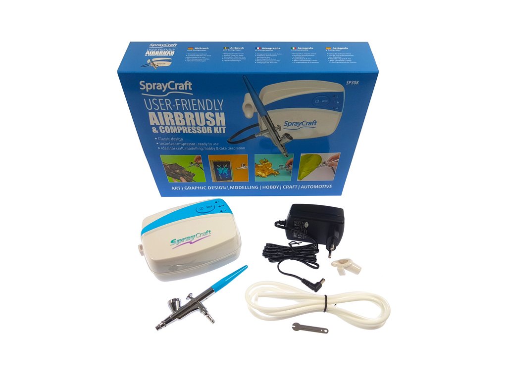 Spraycraft SP30KC je kompletní sada airbrush pro modelářské použití. Balení obsahuje vše potřebné - membránový kompresor se 3 úrovněmi výkonu, kvalitní stříkací celokovovovou pistoli s horní nádobkou a potřebné příslušenství.