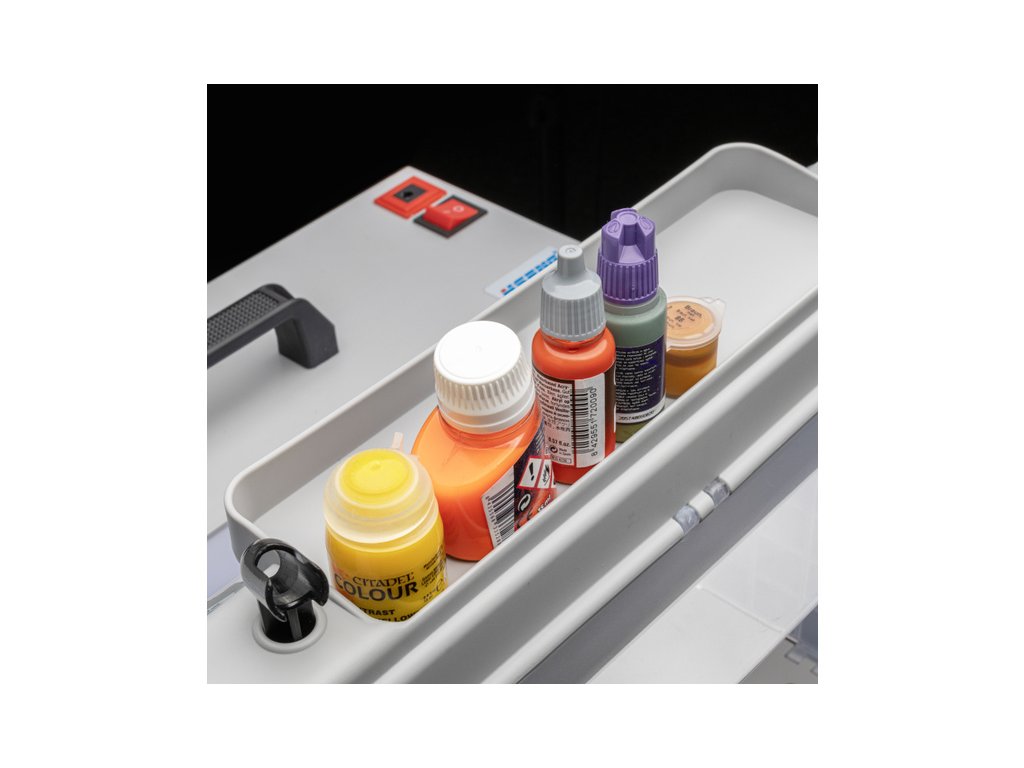 Spraycraft stříkací box s odsáváním, otočným stolem 190 mm, ventilační hadicí a filtrem. Napájení 230 - 240 V/50 Hz, sací výkon 3 m³/min, pracovní vnitřní prostor 41x35x30cm. Stříkací box je praktické řešení pro všechny modeláře, hobby tvůrce i profesionály, kteří pracují s airbrushem a aerosolovými spreji. Box pomáhá zachytit přebytečnou barvu a výpary při stříkání, čímž udržuje pracovní prostor čistý a zlepšuje pracovní podmínky. Díky integrovanému odsávání a filtračnímu systému se dvěma filtry zachytí většinu rozprášených částic barvy. Tři integrované LED světelné pásky zaručují dobrou viditelnost při práci. Na vrchní straně boxu je přihrádka pro lahvičky od barev a držáky pro stříkací pistole.