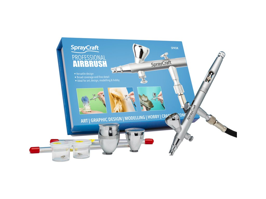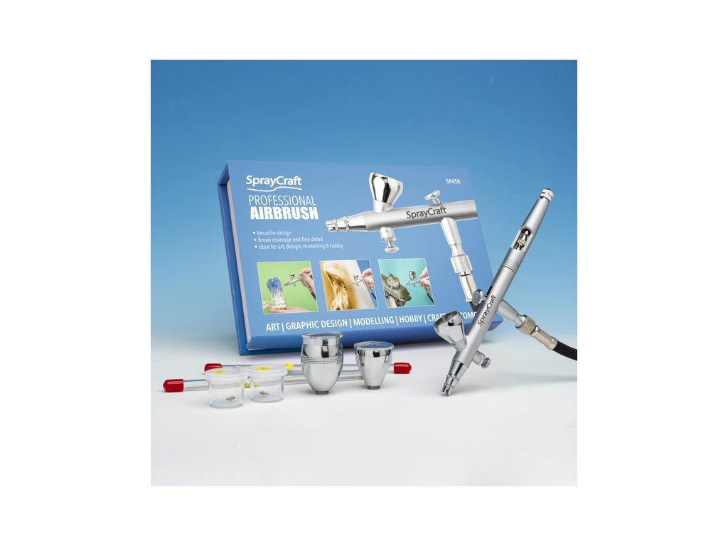 Spraycraft airbrush profesionální dvoučinná stříkací pistole SP45, kdy se stiskem spouště uvolní vzduch a zpětným pohybem se uvolní barva. Sada obsahuje 3 nádobky, 3 sady trysek (0,2, 0,3 a 0,5 mm). Možnost omezení maximálního proudu barvy a vzduchu.