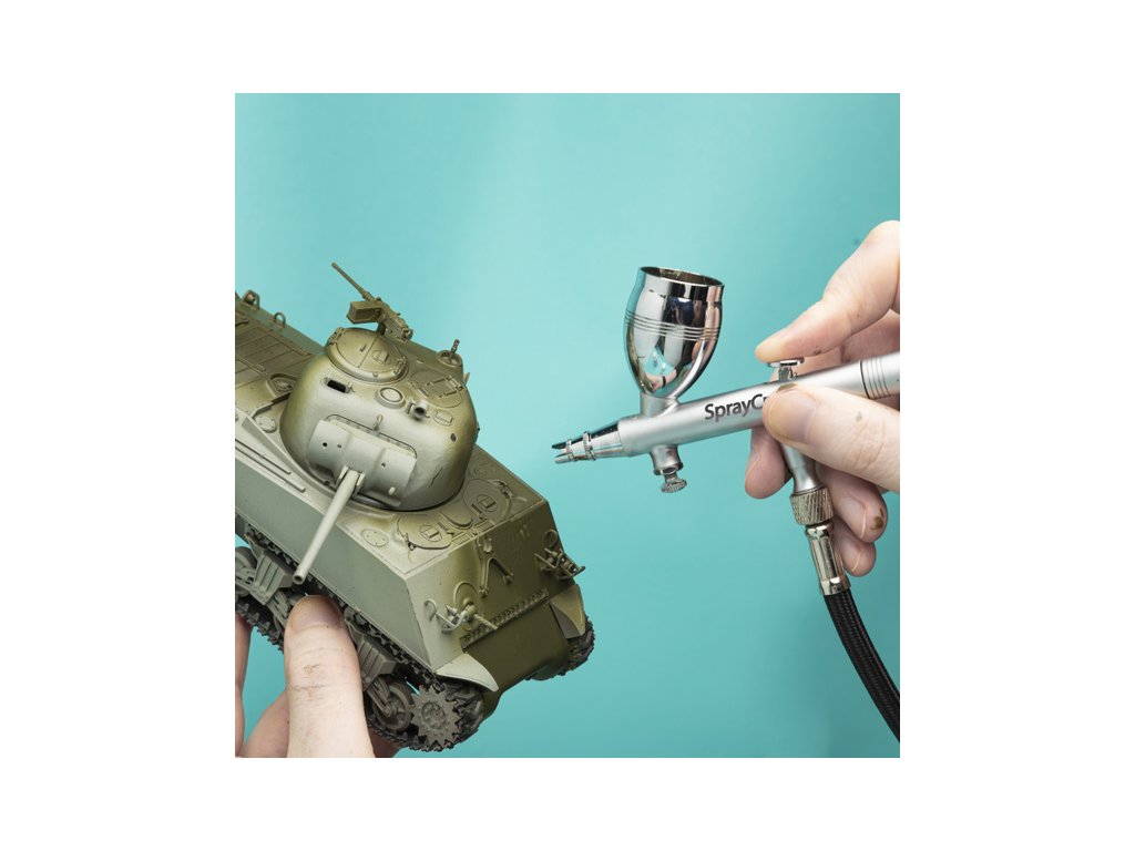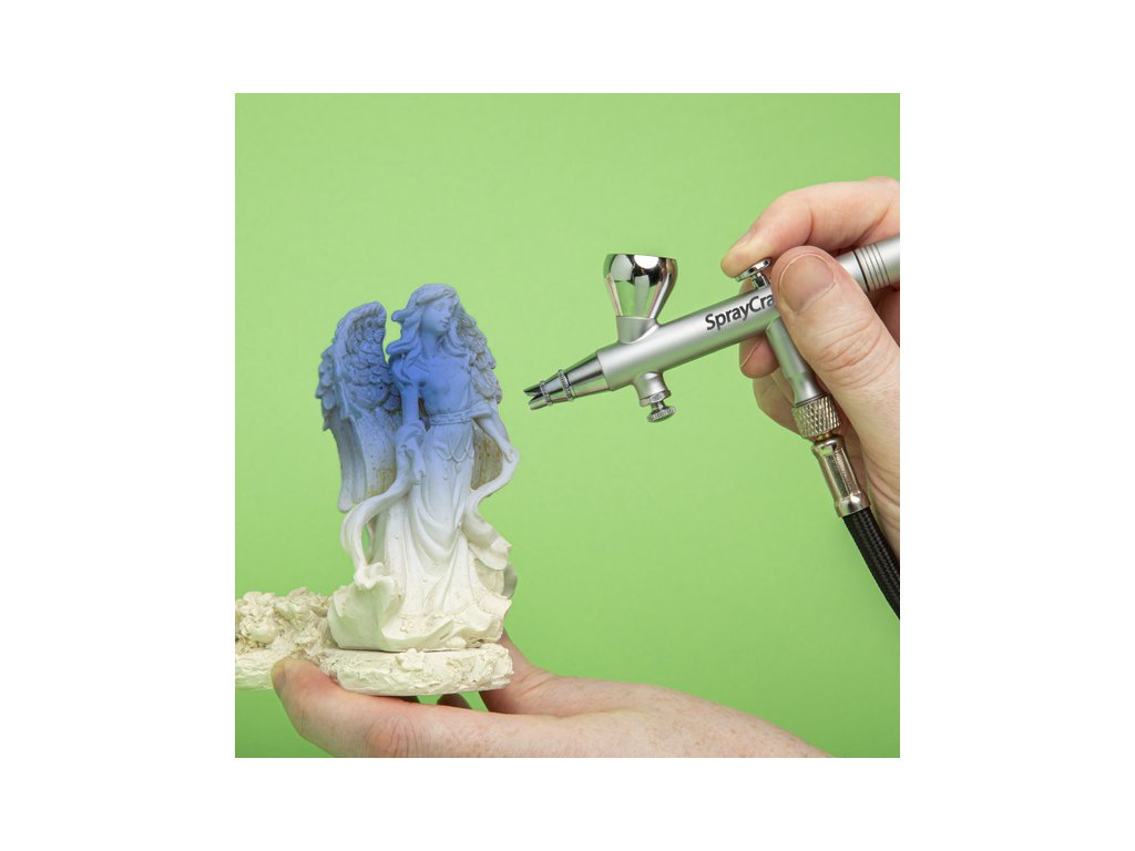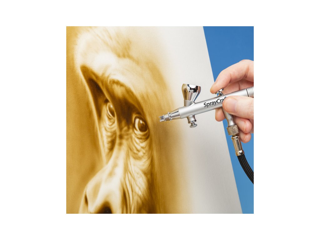 Spraycraft airbrush profesionální dvoučinná stříkací pistole SP45, kdy se stiskem spouště uvolní vzduch a zpětným pohybem se uvolní barva. Trojice výměnných nádobek (2 ccm, 7 ccm a 12 ccm) s vrchním plněním barvy, 3 sady trysek (0,2 mm, 0,3 mm a 0,5 mm). Pistole dále obsahuje šroub pro doladění proudu vzduchu a šroub pro omezení maximálního množství dávkované barvy. Pro profesionály Art, umění a grafiku. Závit pro šroubení hadice se závitem G1/8". Vynikající pro velmi jemné detaily, vyvážené tělo pistole, dobře se drží.