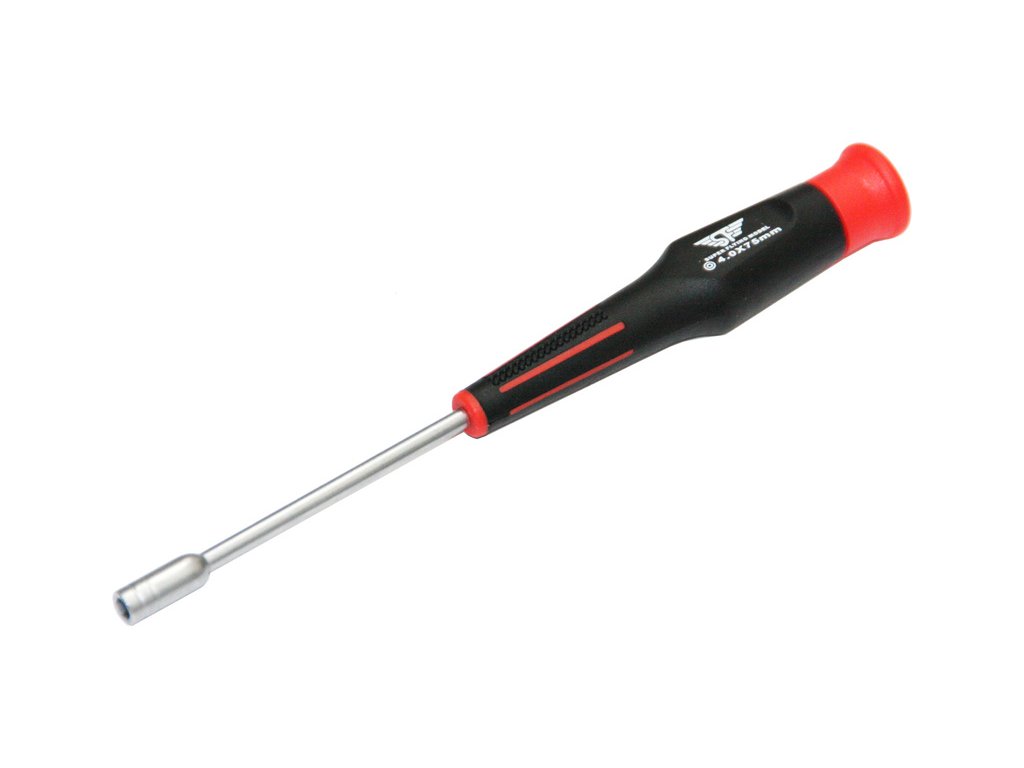 Šroubovák nástrčkový 4.0mm. Délka šroubováku 175 mm, délka dříku 76 mm, délka rukojeti 99 mm a průměr 20 mm.