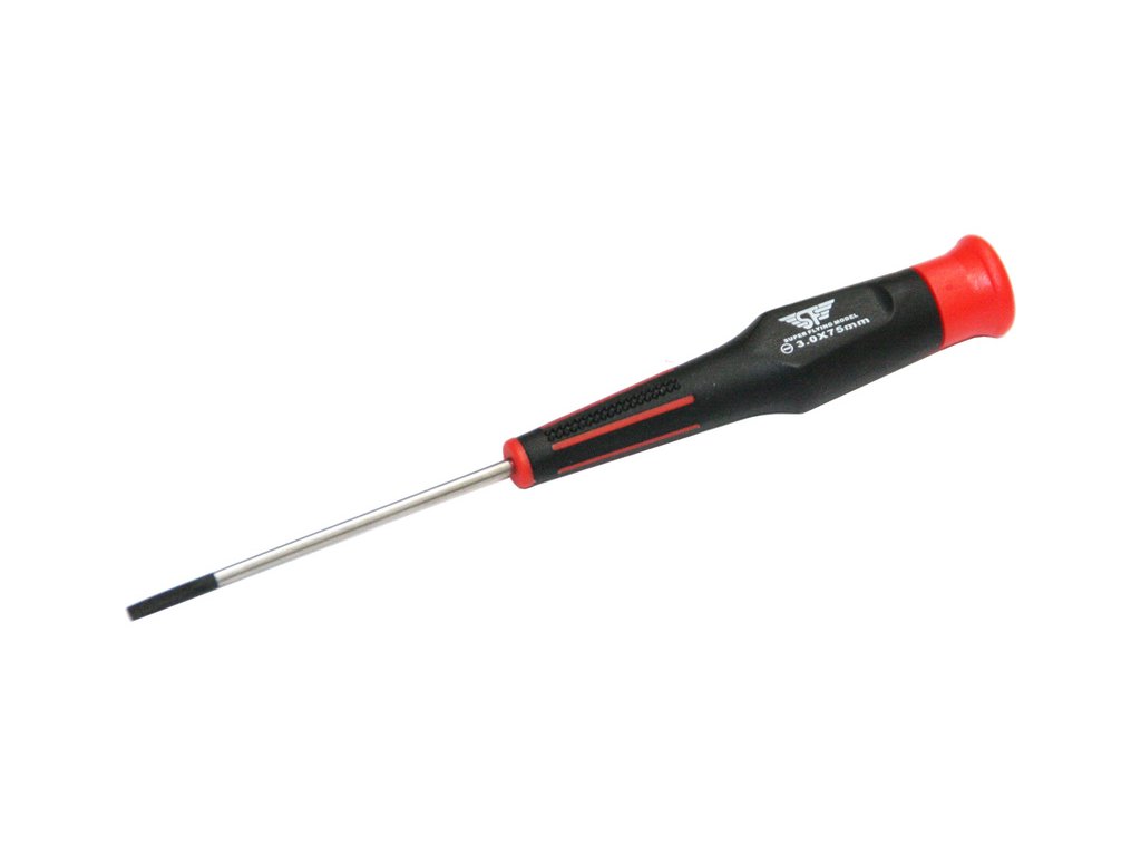 Šroubovák plochý 3.0mm. Celková délka šroubováku 175 mm, délka dříku 75 mm, délka rukojeti 99 mm, průměr 20 mm.