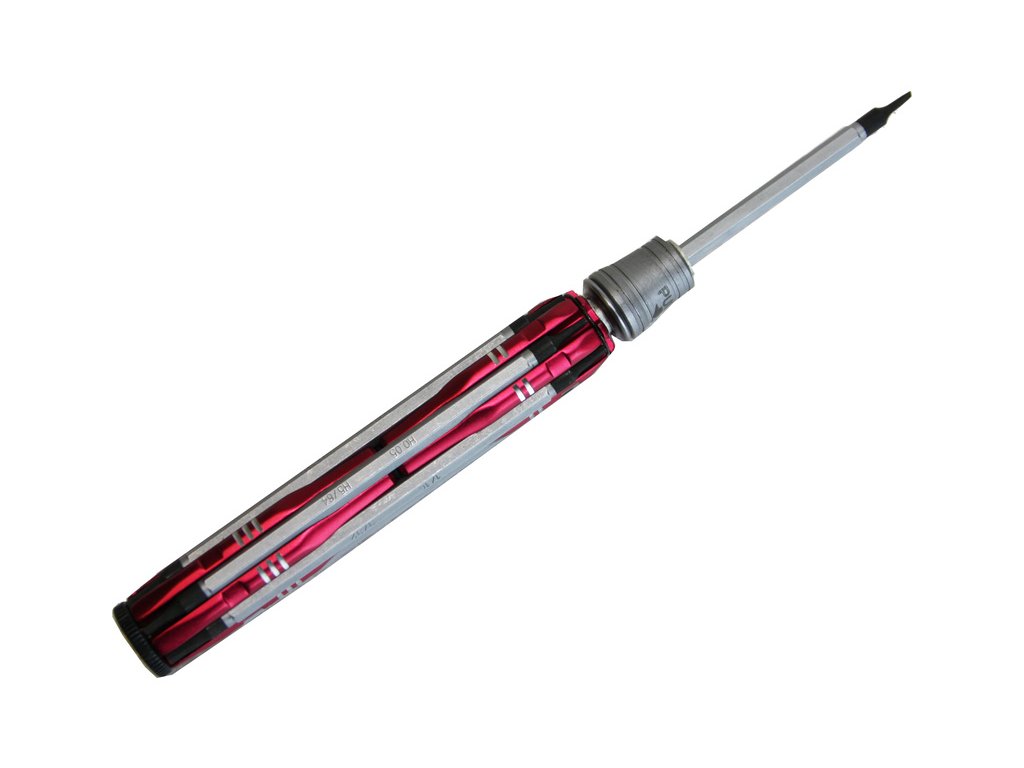 Šroubovák s výměnnými oboustrannými bity, které jsou prakticky integrovány do kovové ručky. Délka bitů 100 mm, možnost regulace délky vysunutí z ručky, délka rukojeti127 mm a průměr 18 mm.