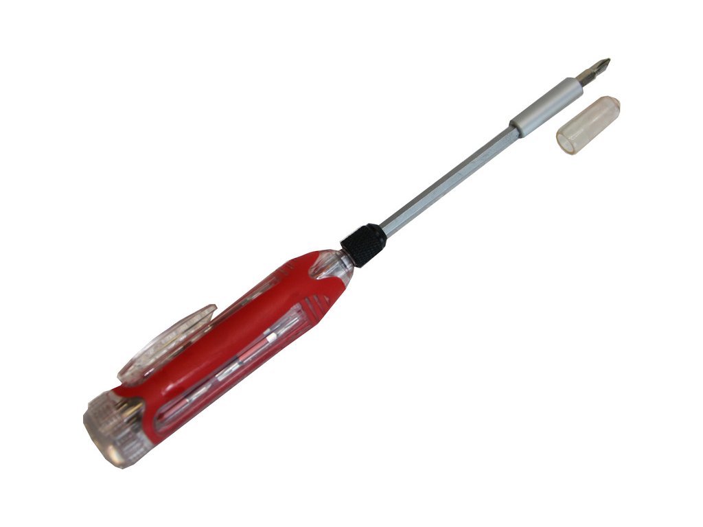 Šroubovák s výměnnými oboustrannými bity, které jsou prakticky integrovány do plastové pogumované ručky. Délka bitů 30 mm, možnost regulace délky vysunutí z ručky, délka rukojeti 105 mm a průměr 20 mm.