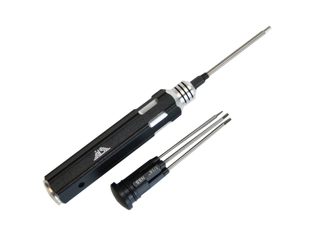 Šroubovák s výměnnými bity vyrobených z HSS oceli. Délka bitů 70 mm, délka dříku 59 mm, délka rukojeti 104 mm a průměr 19 mm. V balení kovová ručka a bity imbus 0.05", 1/16", 5/64", 3/32".