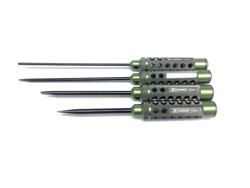 Toto je kombinovaná sada Xceed plochých šroubováků (4 ks.) s novým vzhledem a novým designem. Díky poutavým 2 barevným tónům (zelená a šedý kov) z eloxovaného dutého hliníkového designu rukojeti a špičkám HSS, které poskytují příjemně vypadající, pohodlný a lehčí pocit. Také díky nim jsou odolnější a zároveň zajišťují dobrou přilnavost k hlavě šroubu.