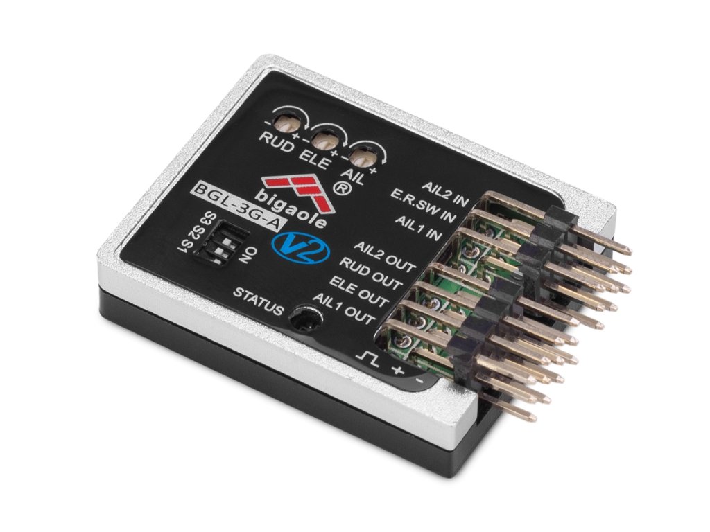 Miniaturní tříosý gyroskopický stabilizátor BGL-3G-A V2 s dvourežimovým heading-hold gyrem pro stabilizaci modelů letadel s klasickými nosnými plochami, samokřídla (delty) i s motýlkovými ocasními plochami, s pohonem elektromotorem i spalovacím motorem. Při správném nastavení umožňuje zvýšit stabilitu a obratnost modelu a učinit jej méně závislým na vlivech okolního prostředí. BGL-3G-A V2 vám pomůže „vypnout vítr“ a bude reagovat na jeho náhlé poryvy daleko rychleji než vy.