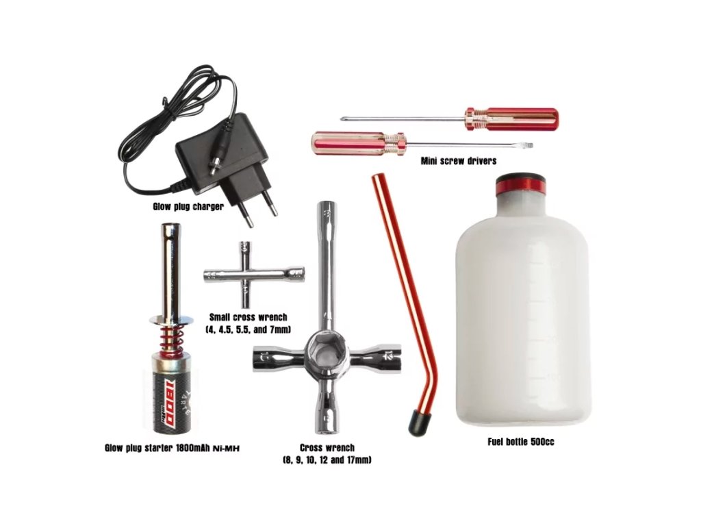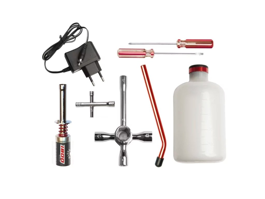 Sada obsahuje 500ml tankovací lahev, 1800mAh žhavítko vč. nabíječe, plochý a křížový šroubovák, velký klíč (8/9/10/12/17 mm) a malý klíč (4/4,5/5,5/7 mm).Doplňkové parametry