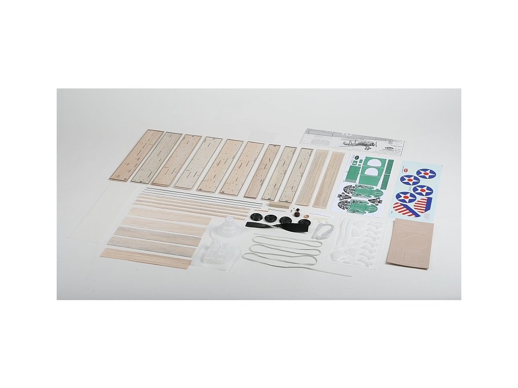 Stavebnice obsahuje: balsové předseknuté díly, balsové nosníky, předseknuté díly z plastikové překližky, vakuově lisované maketové díly (kryt motoru, motor...), plastovou vrtuli s hřídelí a hlavicí, gumový svazek (guma 5x1mm), ocelovou strunu na podvozek a další drobné díly, plastová kola, potahový papír, rukojeť a vahadlo pro upoutaný model, aršík mokrých obtisků, stavební plán.