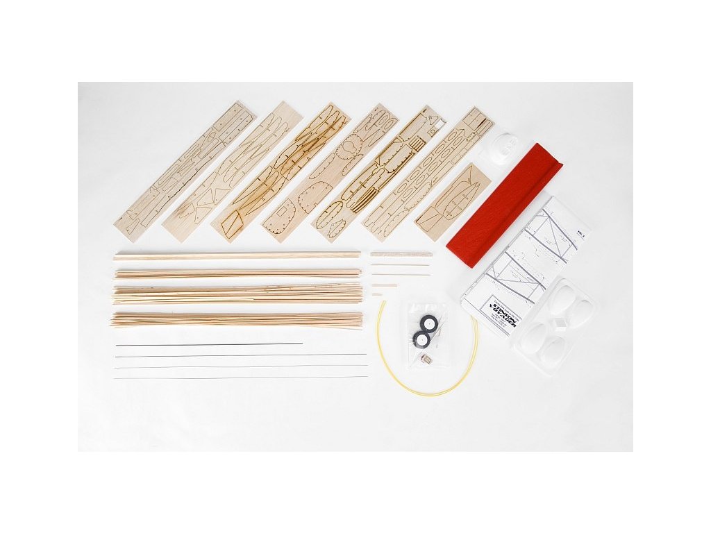 Stavebnice obsahuje: balsové laserem vyřezávané díly, balsové nosníky, vakuově lisované díly (kryt motoru...), čirou plastovou fólii na "zasklení" kabiny, ocelovou strunu na podvozek a další drobné díly, lehká pěnová kola, barevný potahový papír, aršík samolepek, stavební plán.