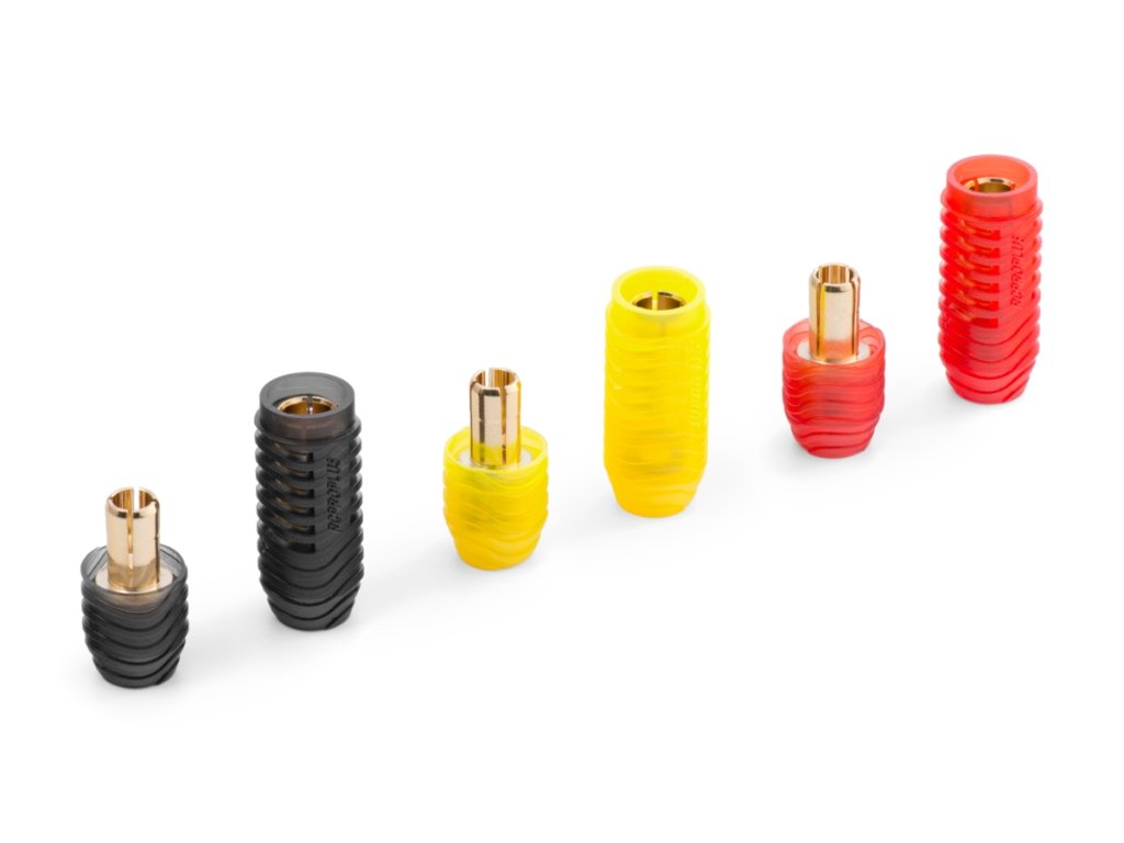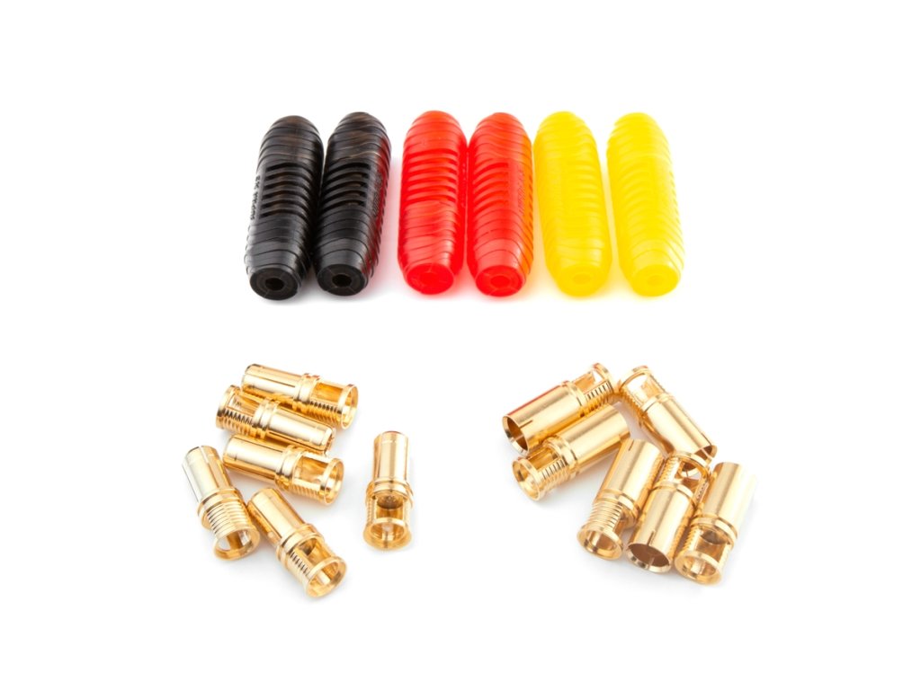 Trojice zlacených 6mm konektorů s domkem pro propojení střídavého regulátoru otáček a motoru. Kabel 5,3-8,3mm2 (8-10AWG), Konstantní proud 160A, špičkový 200A. Balení 6 párů (2 černé, 2 červené a 2 žluté) k propojení celkem 2 motorů a 2 regulátorů.Doplňkové parametry