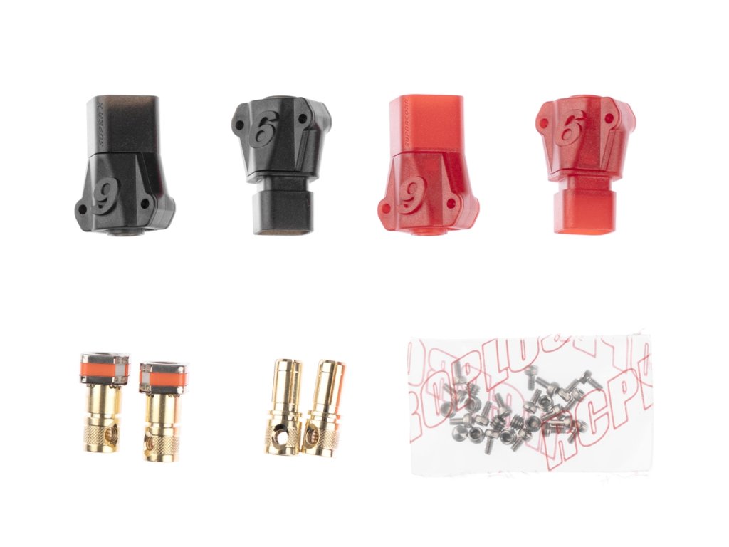 Zlacené 6mm Anti-spark konektory s domkem pro 8,4mm2 (8AWG) kabel. Konstantní proud 240A, špičkový 280A. Max 60V DC. Nepájecí varianta - kabel je zajištěn pomocí dvou imbusových červíků. Balení 2 páry (2x antispark samice + 2x samec). Kompatibilní s S6 6808 ULTRA (REB6808ULTS6P6 a REB6808ULTS6P2).Doplňkové parametry