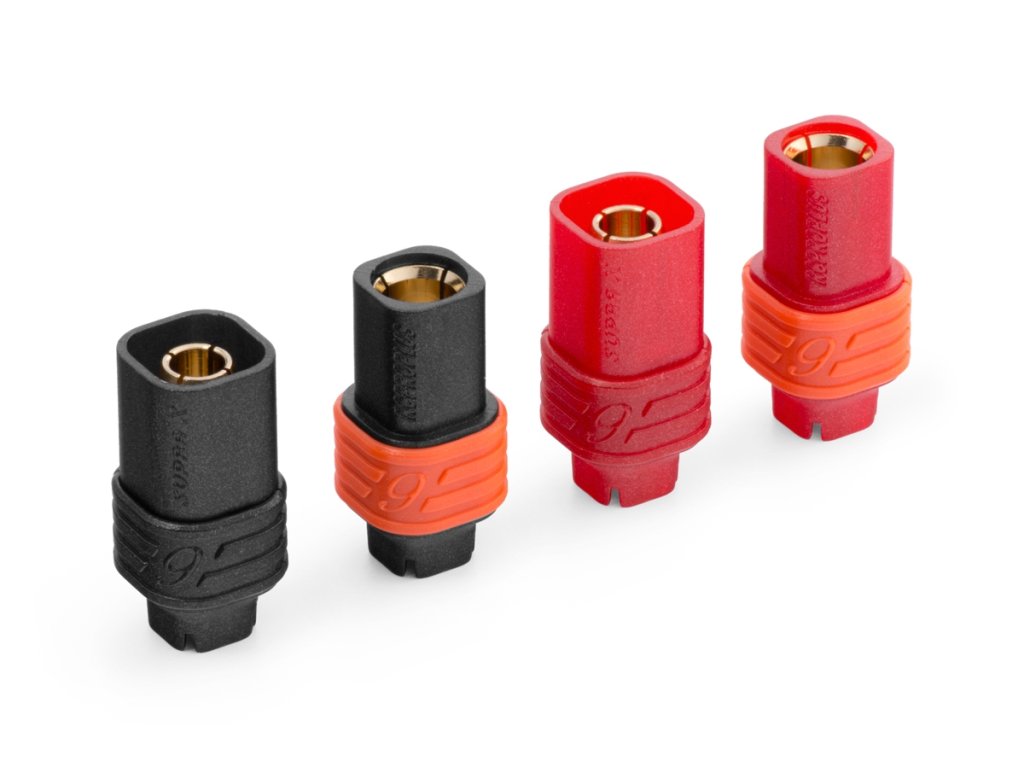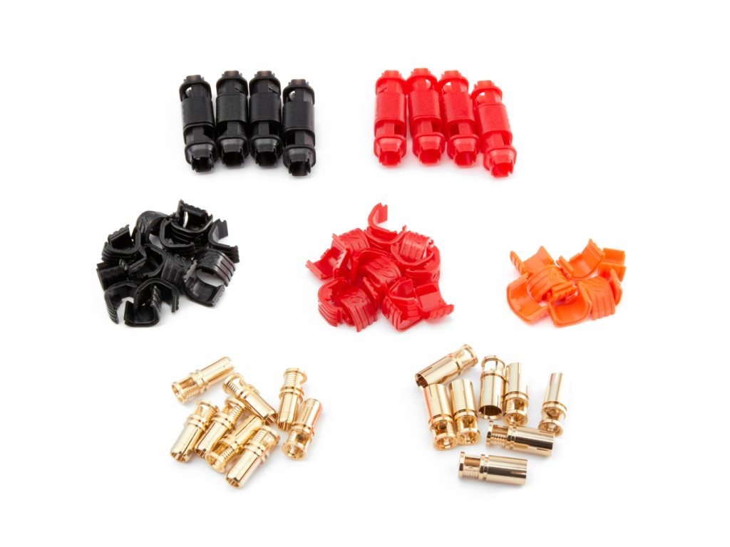 Zlacené 6mm konektory s domkem pro 5-8,4 mm2 (8-10AWG) kabel. Konstantní proud 200A, špičkový 240A. Pájecí varianta. Balení 8 párů (4 červené a 4 černé).