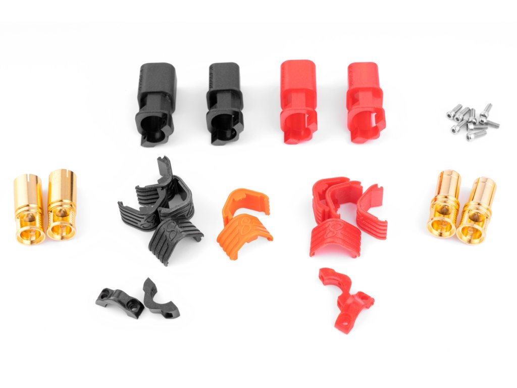 Zlacené 8mm konektory s domkem pro 8,4-13,3mm2 (6-8AWG) kabel. Konstantní proud 270A, špičkový 310A. Max 60V DC. Balení 2 páry (1 červený a 1 černý).