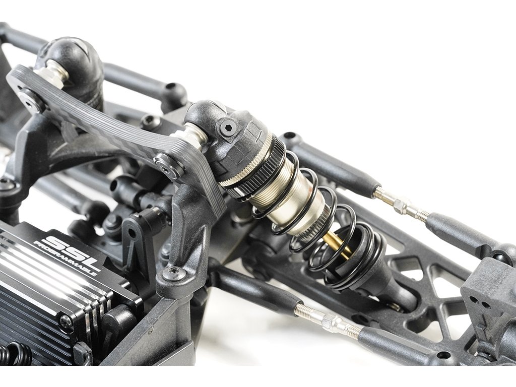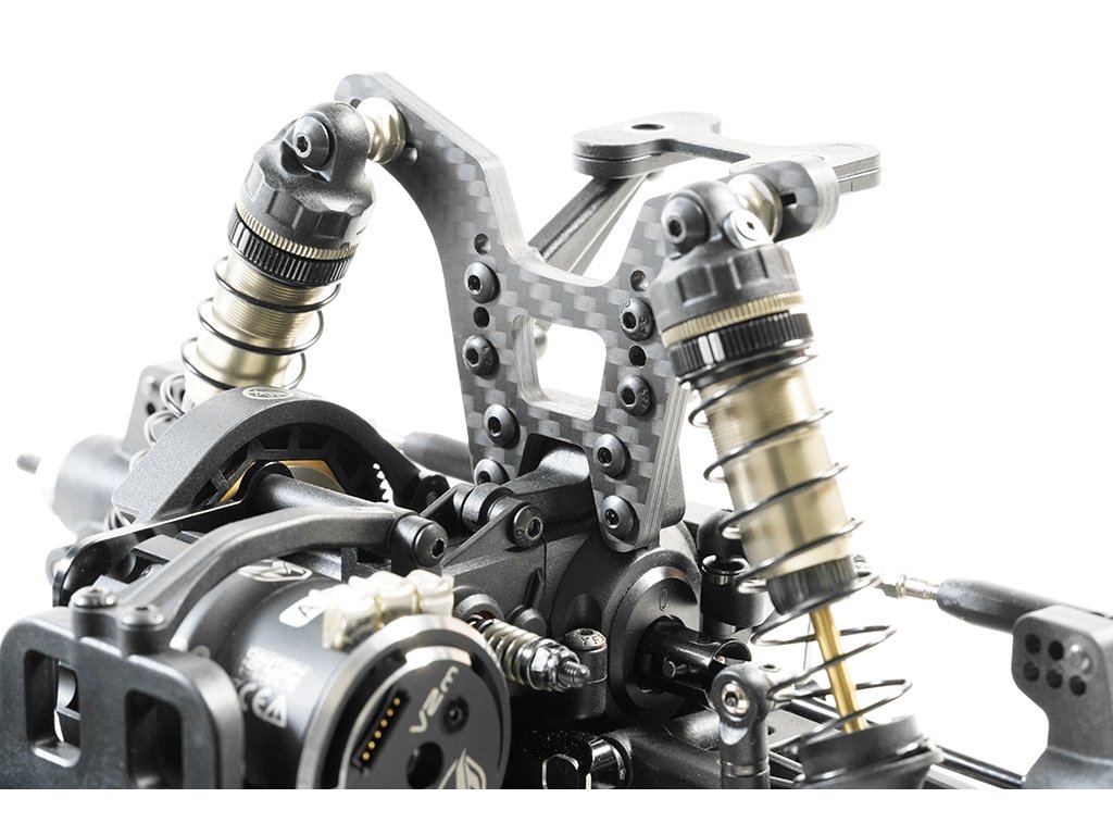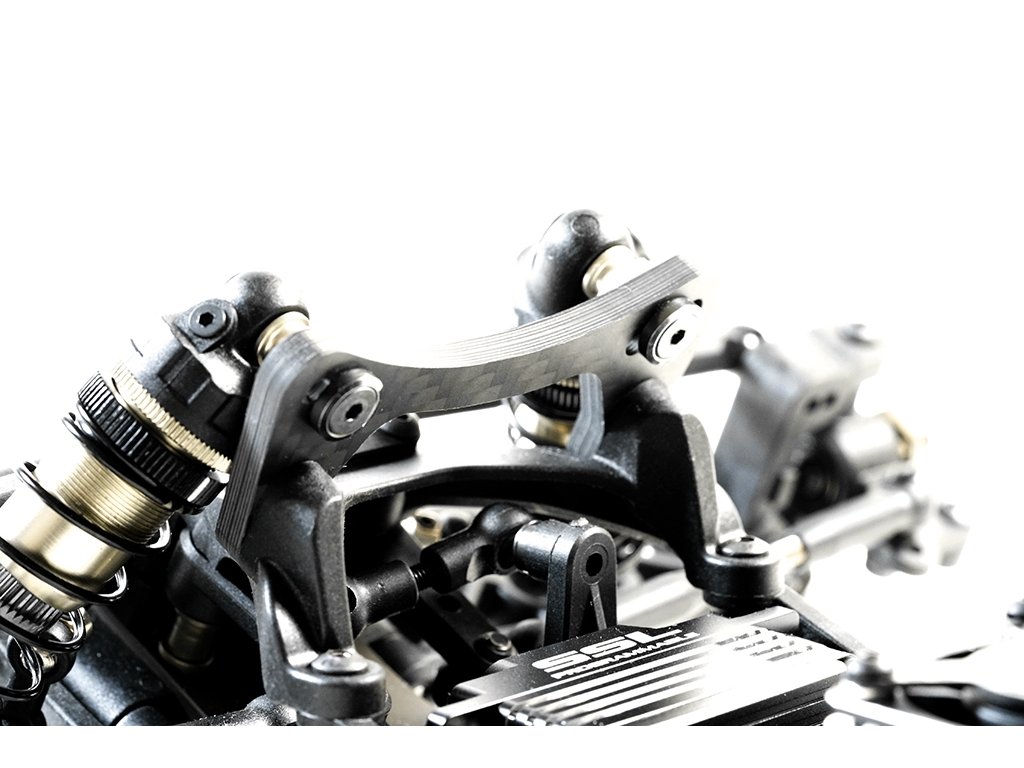 Součástí sady S12-2D EVO LIMITED je zcela nový 5,5mm systém kulových čepů. Součástí je také nastavitelná Ackermann deska a karbonové desky řízení. S12-2D EVO LIMITED má nová zakřivená spodní ramena, která zajišťují nižší polohu tlumičů, což vede ke snížení těžiště.