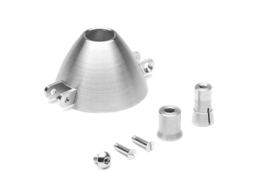 Precizní duralový TURBO kužel pro sklopnou vrtuli o průměru 45 mm s kleštinou 5,0mm, s 3 mm čepy pro vrtulové listy s kořenem o tlouštce 8 mm. Vyrobeno v České republice.Doplňkové parametry