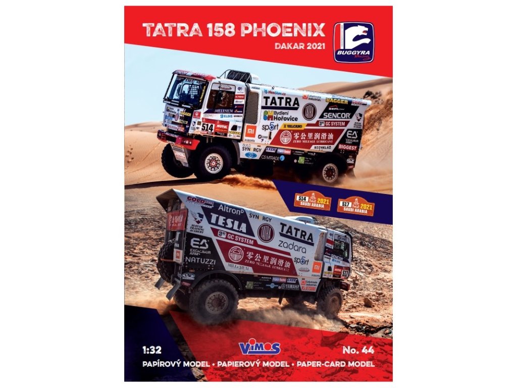 Papírový model kamionu Tatra 158 Phoenix týmu Buggyra z Rallye Dakar 2021. Vystřihovánka je zpracována v měřítku 1:32.