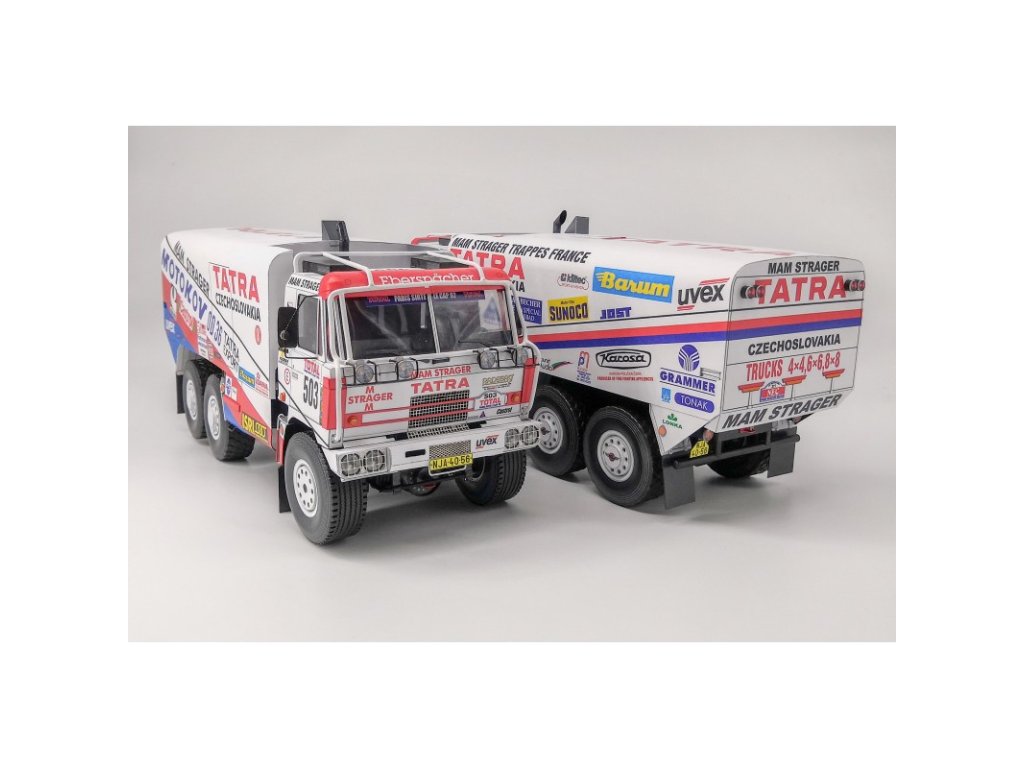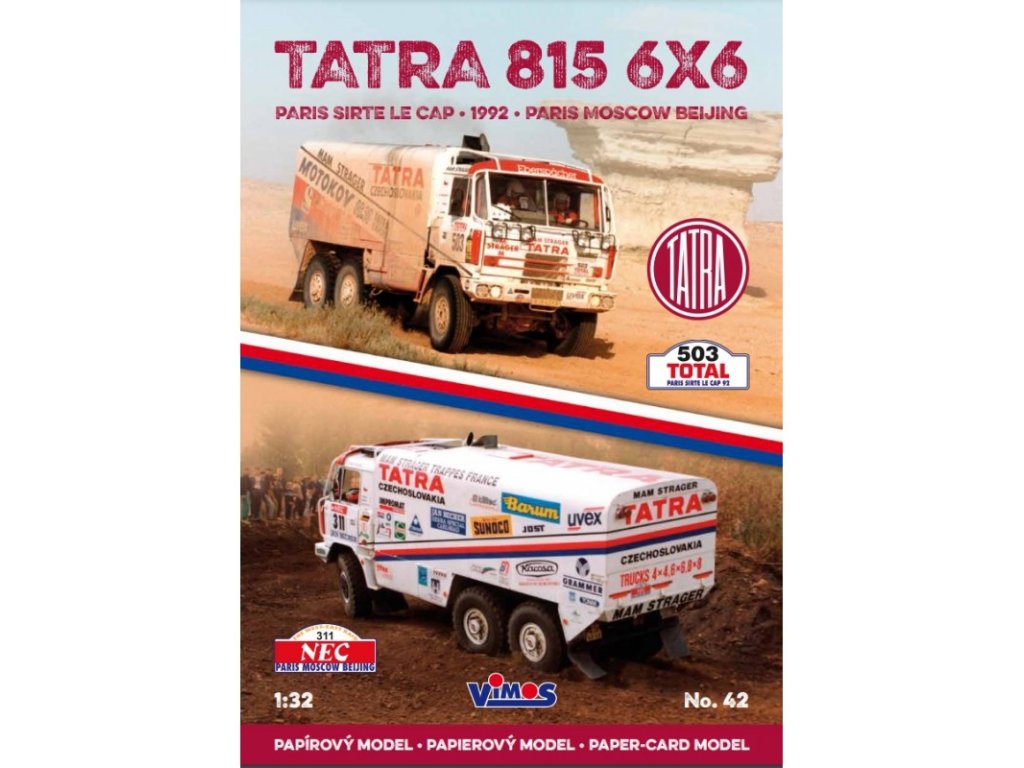 Model legendární dakarské šestikolky Tatra 815 z roku 1992 Zdeňka Kahánka ve variantní dvojverzi s Rallye Paříž - Kapské Město a Rallye Paříž - Peking v podobě vystřihovánky. U vystřihovánky je použito měřítko 1:32.