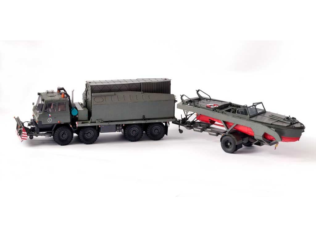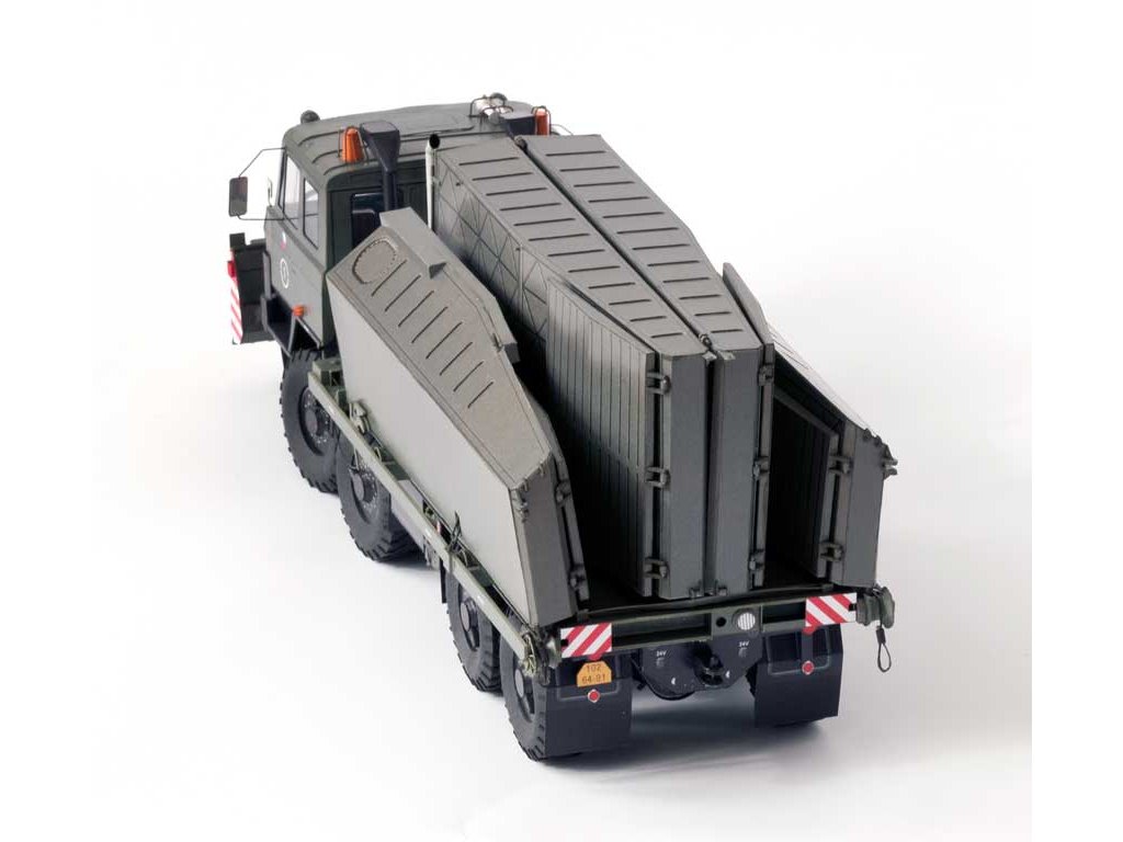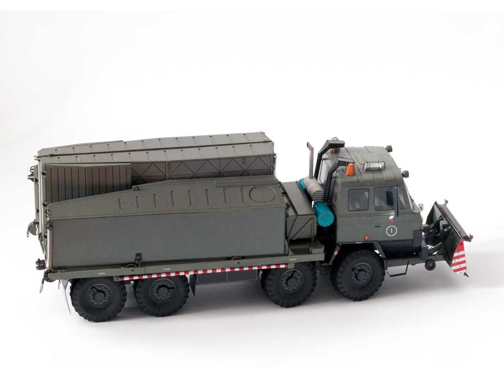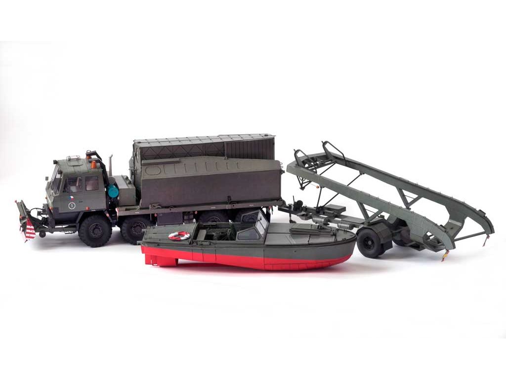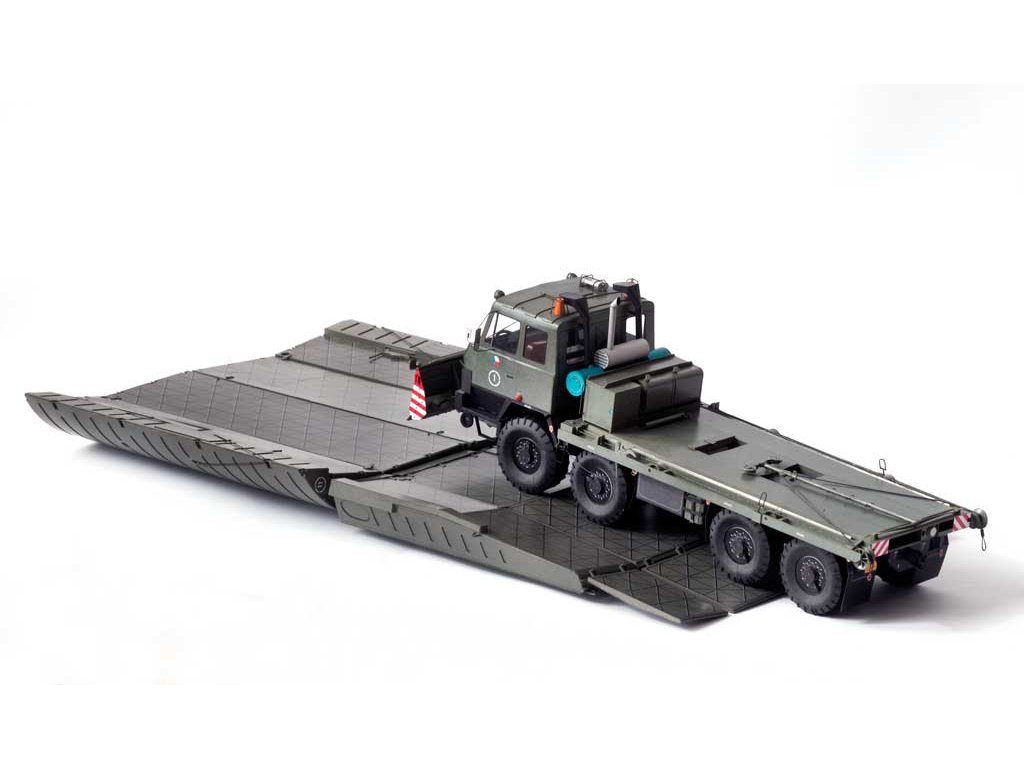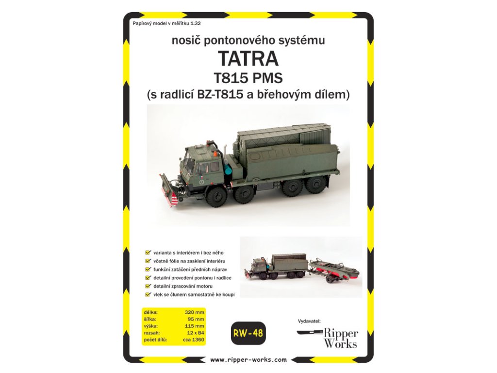 Model můžete vytvořit s interiérem kabiny či bez něj, se zatáčecími koly, sklopnou kabinou, funkčními tažnými zařízeními a vyklápěcím stožárkem. Vystřihovánka obsahuje radlici BZ-T815 - tuto nemusíte osazovat, neboť některé nosiče jí v současnosti nemají. Za tímto nosičem břehového pontonu se vozí přivěšený člun MO-634 (vydává RipperWorks pod označením RW-50). Celou sadu si můžete doplnit také nosičem říčního dílu (vydává RipperWorks pod označením RW-49). Znaky AČR na dveřích můžete přelepit přiloženými znaky OS SR.