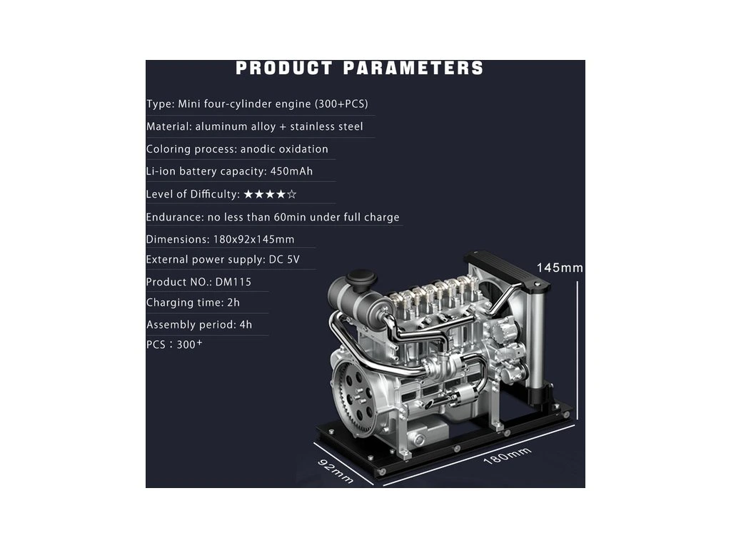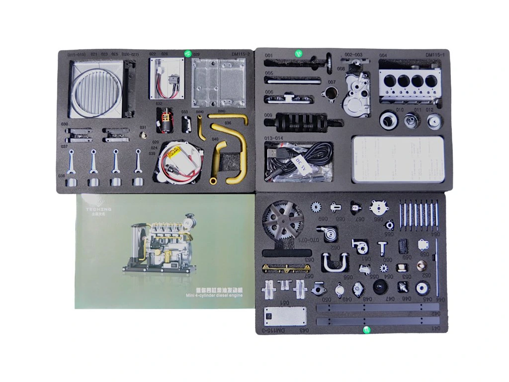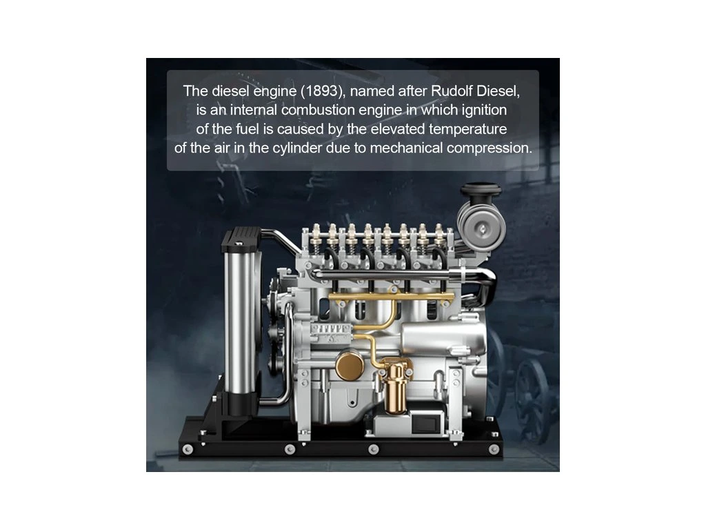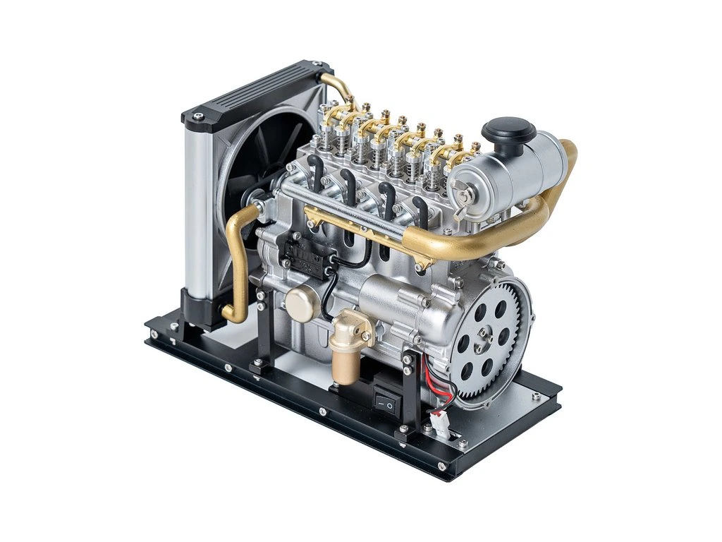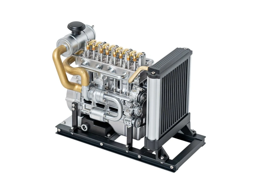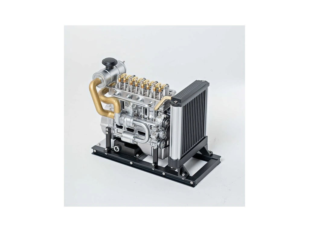 Stavebnice precizního kovového modelu Teching - dieselový motor Mini. Věrně zpracovaná konstrukce skutečného motoru se všemi detaily, včetně chladiče. Model obsahuje realistické mechanické funkce - pohyb pístů, ventilů, hřídelí a rozvodů. Elektrické otáčení motoru. Výstavní model.