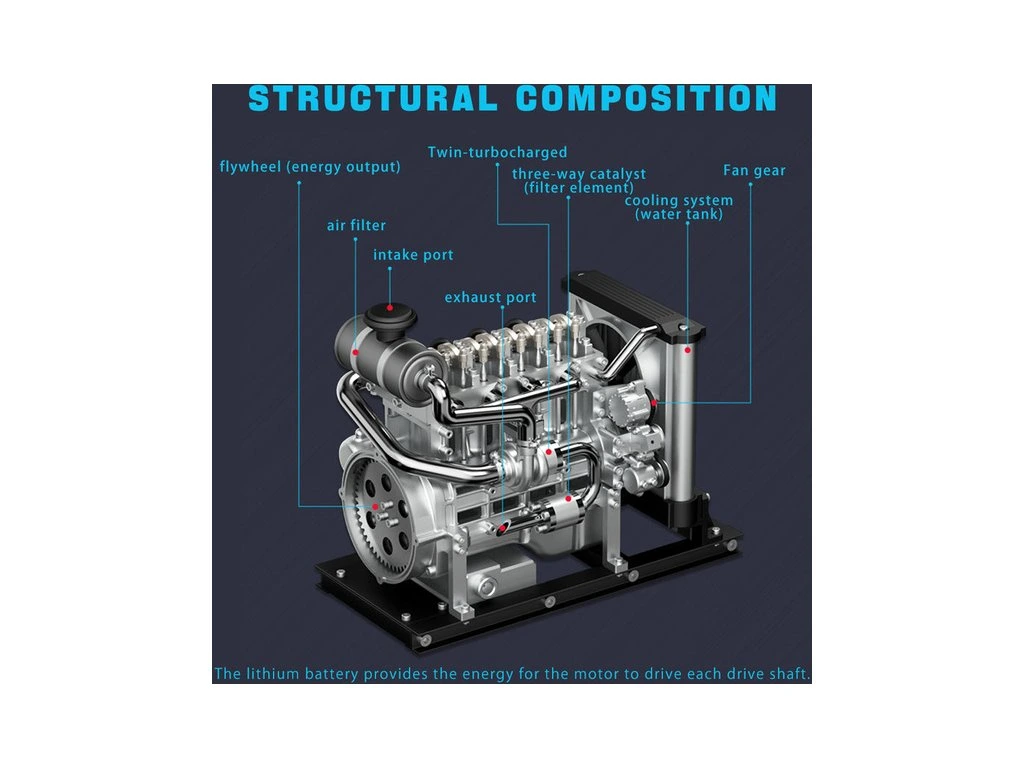 Stavebnice precizního kovového modelu Teching - dieselový motor Mini. Autenticky zpracovaná konstrukce skutečného motoru se všemi detaily, včetně maketového startéru, alternátoru, turbodmychadla, hlav válců, olejového filtru a chladiče. Model nabízí realistické mechanické funkce - pohyb pístů, ventilů, hřídelí a rozvodů. Prostřednictvím průzorů a otevřené hlavy motoru můžete pozorovat synchronizovaný pohyb komponentů. Motor má elektrické otáčení. Stavebnice je navržena tak, aby již samotné sestavování bylo zážitkem. Díky vysoce kvalitnímu zpracování a viditelné funkčnosti jednotlivých částí je model vhodný jako výstavní a reprezentativní solitér nebo jako učební pomůcka. Model ocení studenti, nadšenci do techniky a sběratelé. Jedná se o originální návrh a výrobu značky Teching s přesně opracovanými kovovými díly, obrazovým návodem pro snadné sestavení a v prémiovém balení.