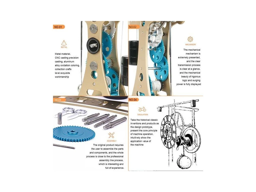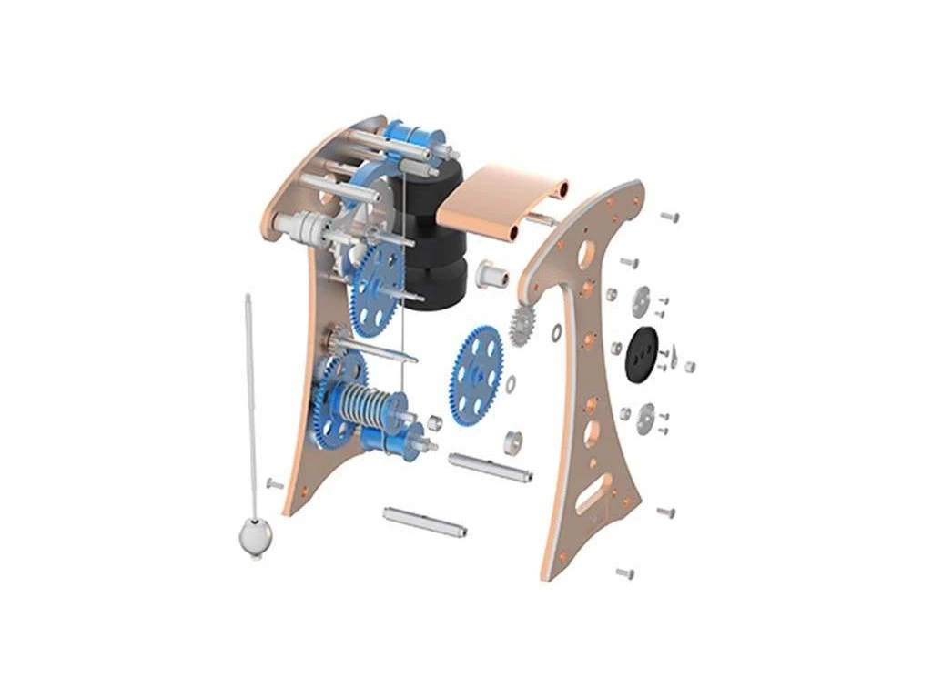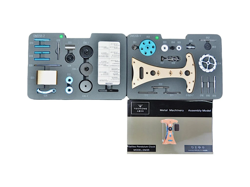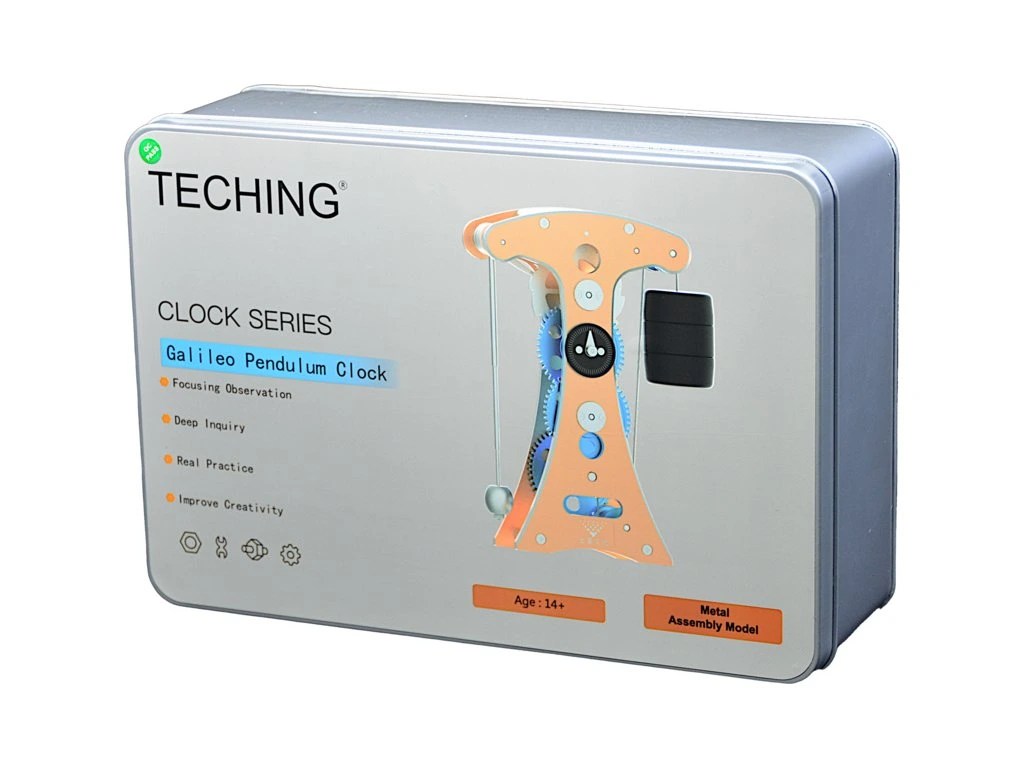 Stavebnice precizního kovového modelu Teching - Galileovy kyvadlové hodiny. Otevřená konstrukce umožňuje si prohlédnout funkci kyvadlového stroje a demonstruje základní mechanické principy. Model se ručně natahuje a po jednom natažení kyvadlo osciluje 5-10 minut. Nejedná se o hodinový stroj ale demonstrační model znázorňující princip hodinového stroje. Jednotlivé díly jsou přesně obráběny na CNC strojích a eloxovány pro zářivý barevný povrch. Stavebnice je navržena tak, aby již samotné sestavování bylo zážitkem. Díky vysoce kvalitnímu zpracování a viditelné funkčnosti jednotlivých částí je model vhodný jako výstavní a reprezentativní solitér nebo jako učební pomůcka. Model ocení studenti, nadšenci do techniky a sběratelé. Jedná se o originální návrh a výrobu značky Teching s přesně opracovanými kovovými díly, obrazovým návodem pro snadné sestavení a v prémiovém balení.