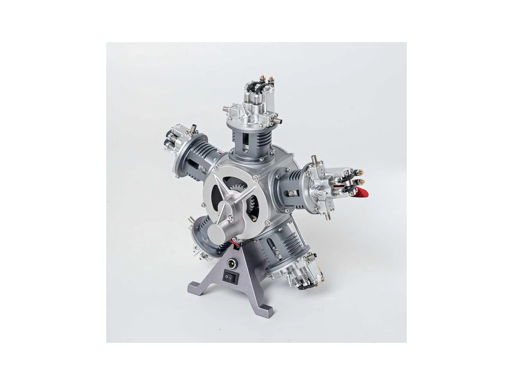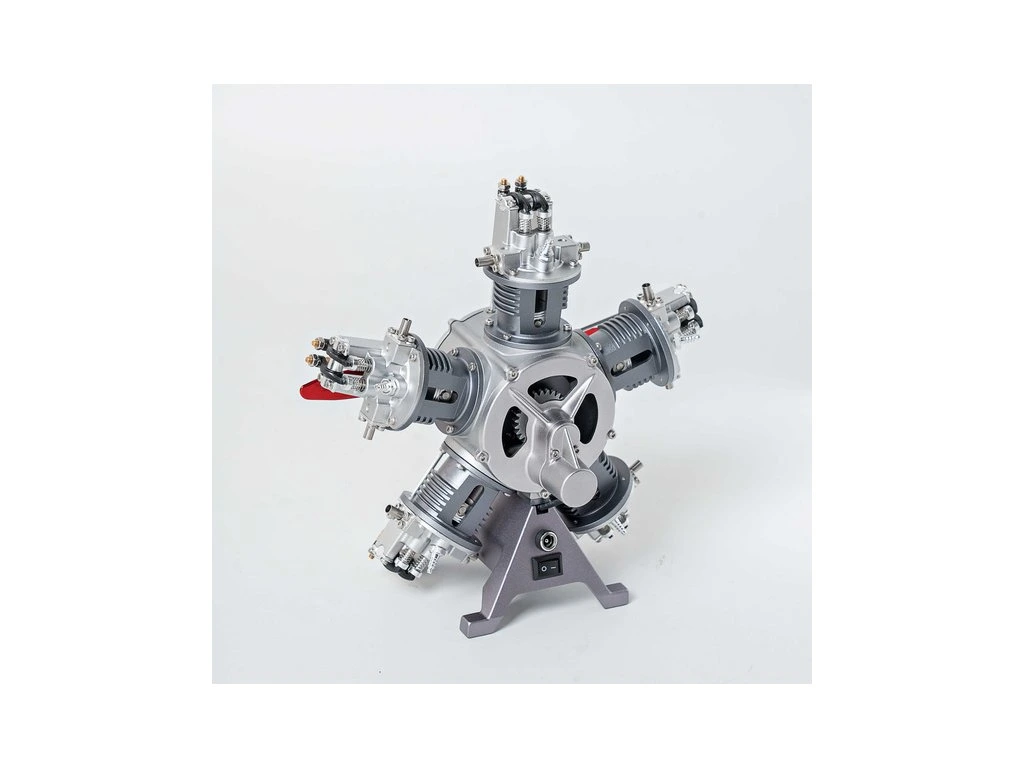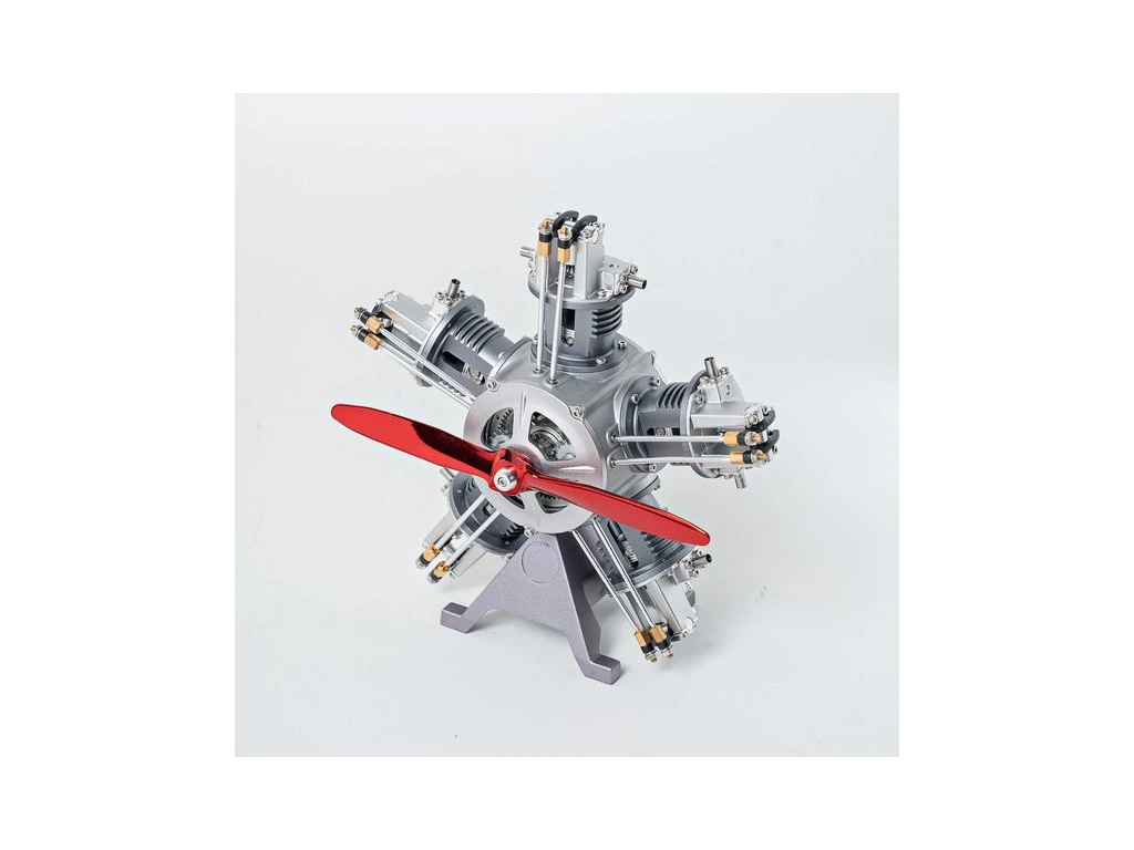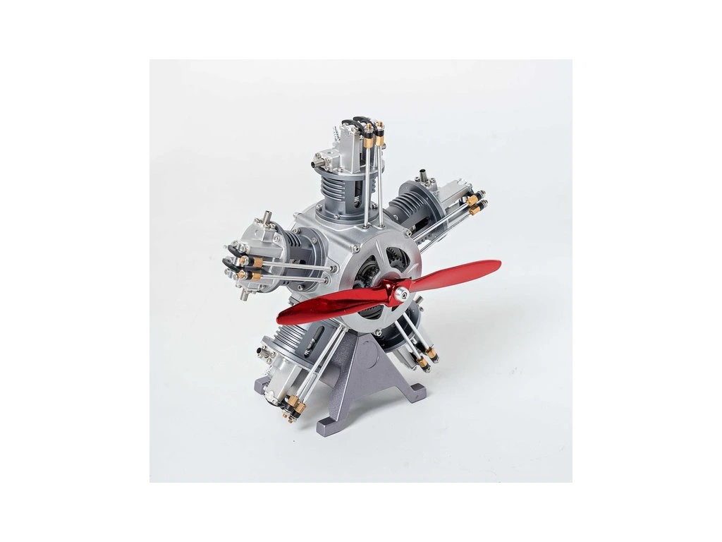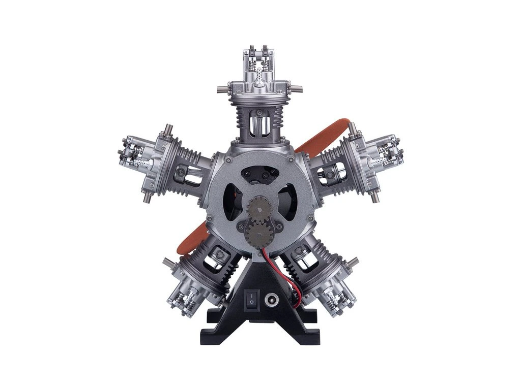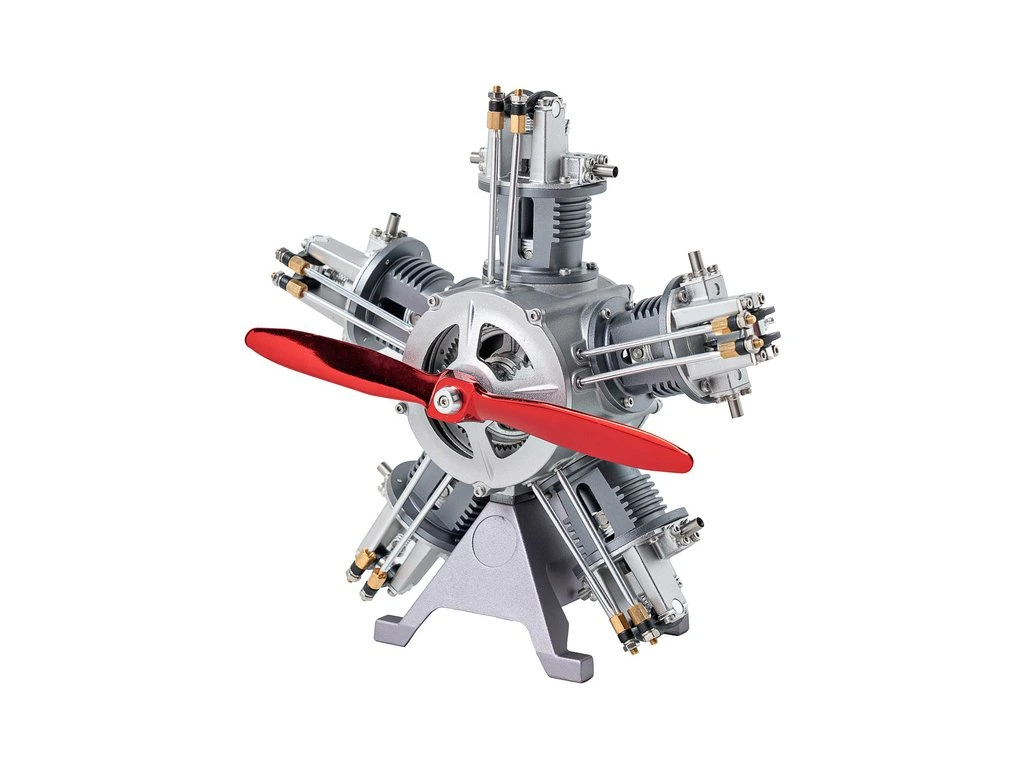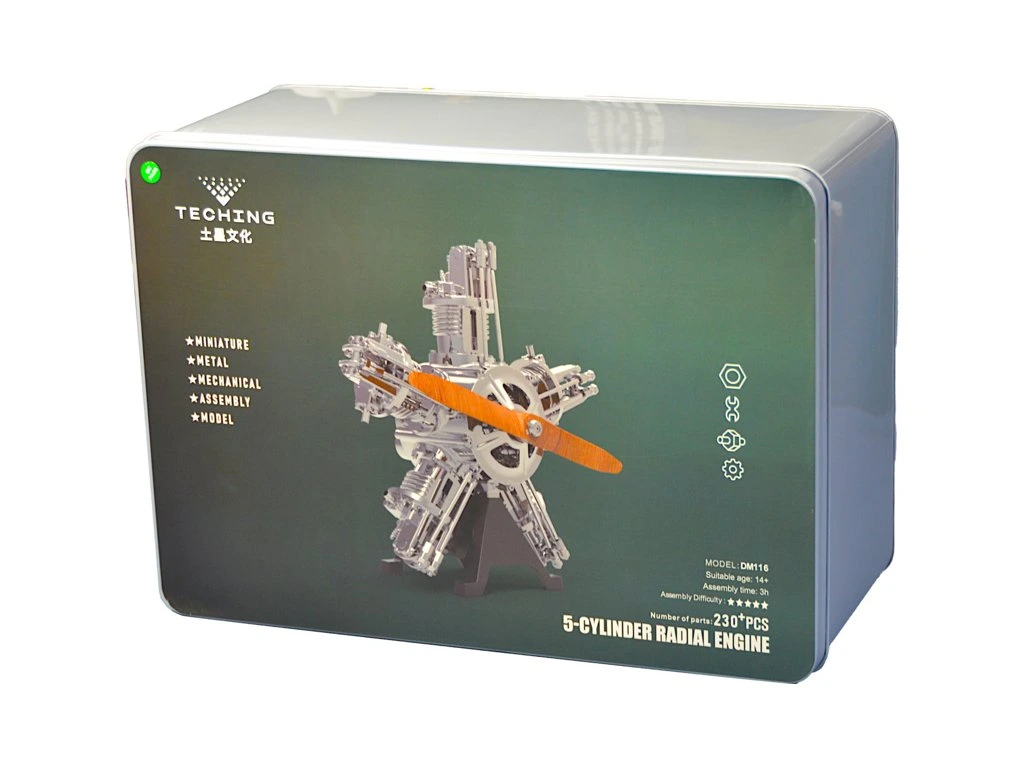 Stavebnice precizního kovového modelu Teching - hvězdicový motor pětiválcový. Detailně reprodukovaná konstrukce reálného radiálního motoru. Model obsahuje realistické mechanické funkce - pohyb pístů, klikové hřídele, vahadel, ventilů. Elektrické otáčení motoru. Výstavní model.