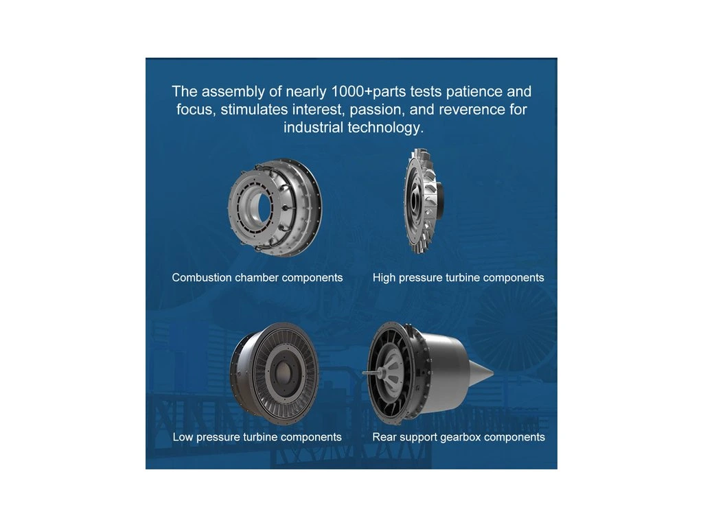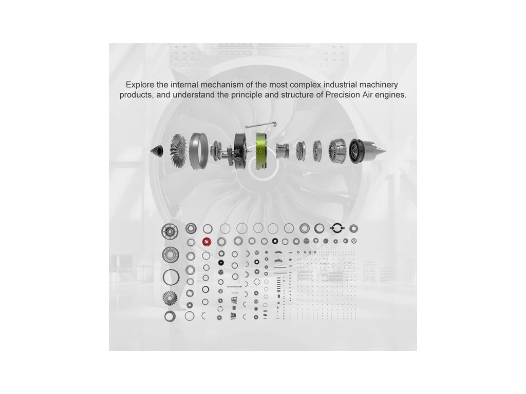 Stavebnice precizního kovového modelu Teching - proudový motor 1:10. Autenticky zpracovaná konstrukce skutečného motoru s průzory pro ukázku provozu. Model nabízí realistické mechanické funkce - pohyb rotoru všech stupňů. Elektrické otáčení motoru a zvukové efekty. Výstavní model.