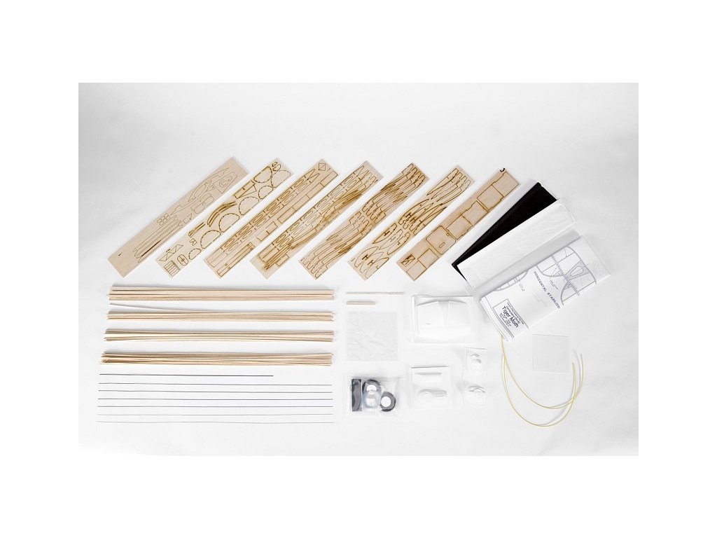 Stavebnice obsahuje: balsové laserem vyřezávané díly, balsové nosníky, vakuově lisované díly (kryt motoru...), čirou plastovou fólii na větrný štítek, ocelovou strunu na podvozek a další drobné díly, lehká pěnová kola, barevný potahový papír, aršík samolepek, stavební plán.