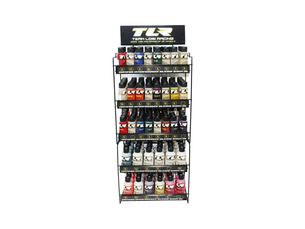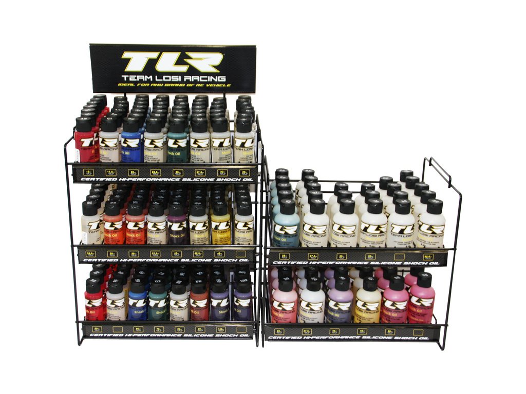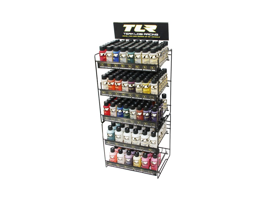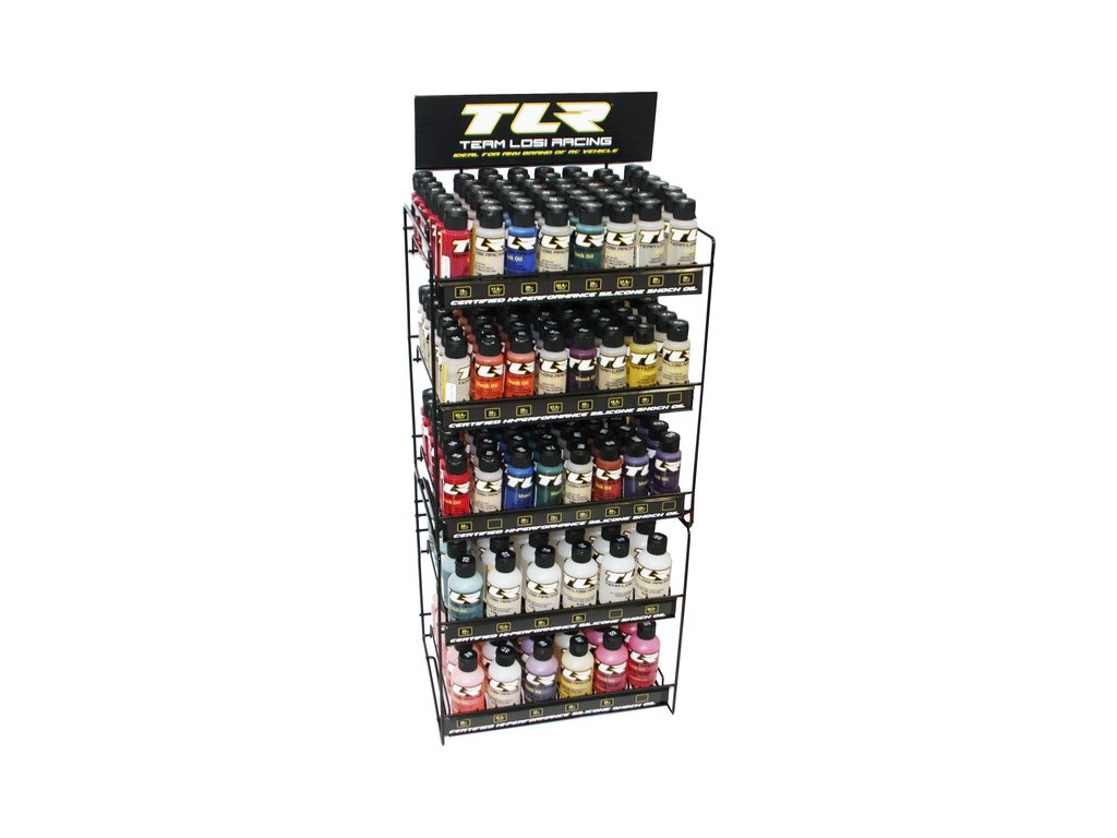 Prodejní 2-dílný stojan pro silikonové oleje s logem Team Losi Racing. Obsahuje samolepky pro popis druhů olejů ve stojanu. Obsahuje 50ks lahviček o objemu 120ml a 161ks lahviček o objemu 60ml. Vyrobeno v USA v rámci přísných technických tolerancí TLR.