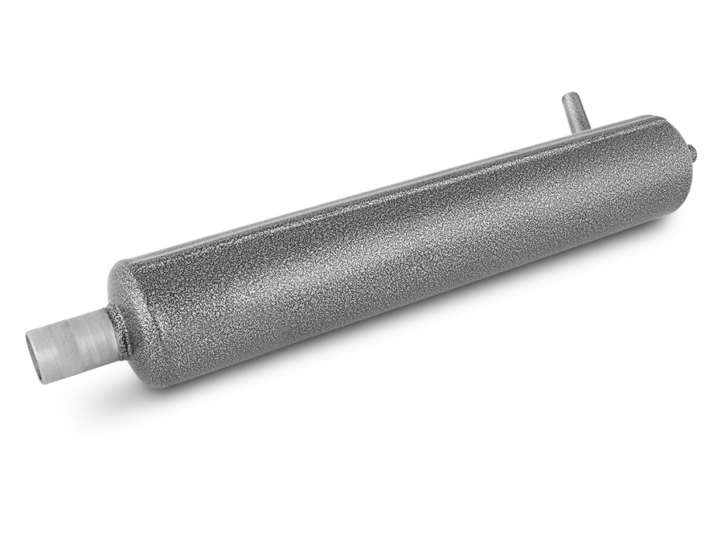 Čtyřkomorový expanzní tlumič pro benzinový motor o obsahu válce 70-80ccm. Zadní výtok ve spodní části tlumiče.