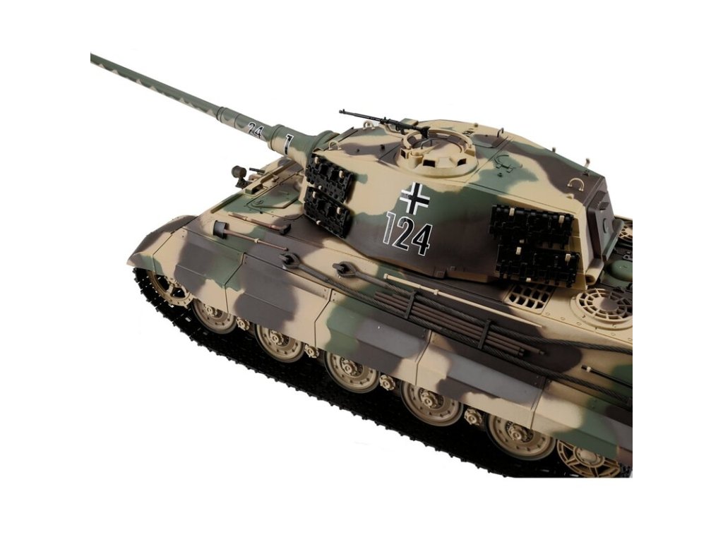 Výkonný model tanku má RC ovládání 2,4 GHz. Tank je vybaven IR i BB Airsoft bitevním systémem, takže jsou možné bitvy mezi modely. Motory s optimalizovaným točivým momentem dodávají modelu Königstiger Henschel vícebarevná kamufláž přesnou a plynulou jízdu. Díky proporcionálnímu ovládání se můžete s tankem přiblížit velmi pomalu a plynule zvyšovat rychlost. Königstiger Henschel vícebarevná kamufláž se pohybuje dopředu a dozadu včetně zatáčení. Lze jej také na místě otočit doleva nebo doprava. Můžete zvednout a spustit dělo a otočit věž o 320 stupňů (na každou stranu 160°). Realistický zážitek završuje zvuky motoru a kouř z výfuku.