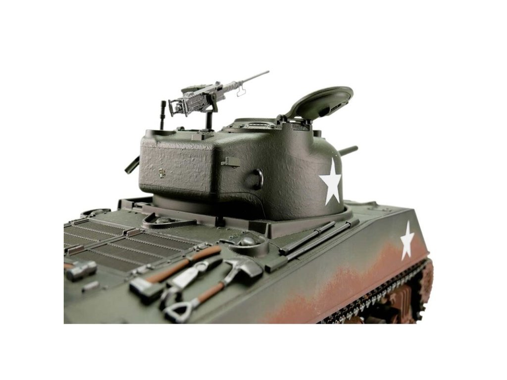 Výkonný model tanku má RC ovládání 2,4 GHz. Vozidlo je vybaveno IR bitevním systémem, takže jsou možné bitvy s vozidly ze stejné série. Motory s optimalizovaným točivým momentem dodávají modelu M4A3 Sherman 75mm přesnou a plynulou jízdu. Kovové převody s robustními převody a vylepšeným převodem zajišťují větší výkon. Díky proporcionálnímu ovládání se můžete s tankem přiblížit velmi pomalu a plynule zvyšovat rychlost. M4A3 Sherman 75mm se pohybuje dopředu a dozadu, také s otočením doleva a doprava. Lze jej také na místě otočit doleva nebo doprava. Můžete zvednout a spustit dělo a otočit věž o 360 stupňů. Realistický zážitek završují různé zvuky motoru, zpětný zákluz hlavně, záblesk hlavně a kouř z výfuku.