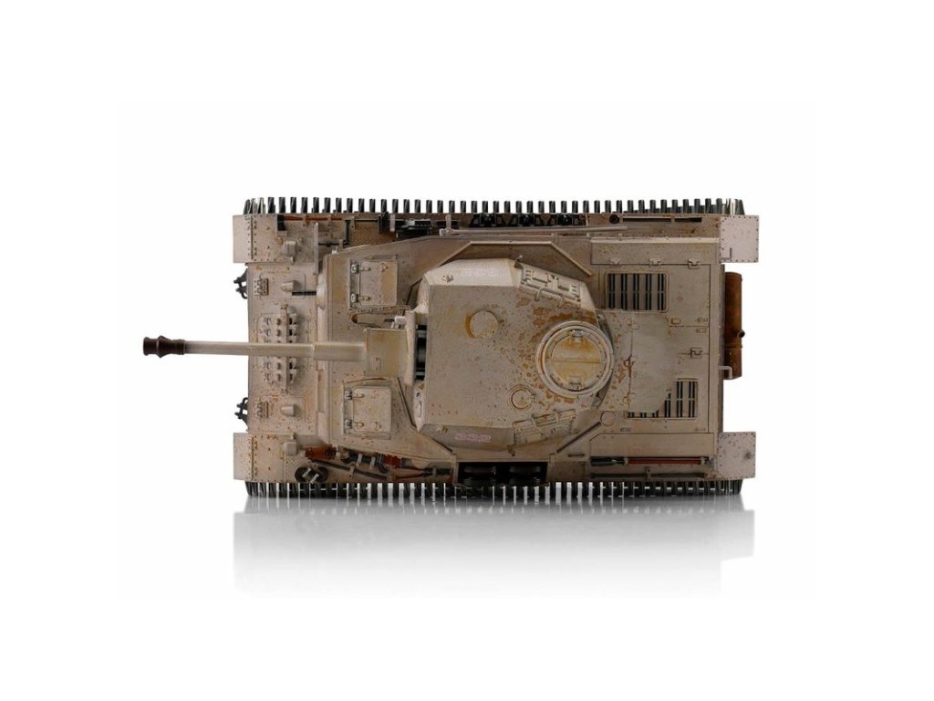 Výkonný model tanku má RC ovládání 2,4 GHz. Vozidlo je vybaveno IR bitevním systémem, takže jsou možné bitvy s vozidly ze stejné série. Motory s optimalizovaným točivým momentem dodávají modelu PzKpfw IV Ausf. G kamufláž přesnou a plynulou jízdu. Kovové převody s robustními převody a vylepšeným převodem zajišťují větší výkon. Díky proporcionálnímu ovládání se můžete s tankem přiblížit velmi pomalu a plynule zvyšovat rychlost. PzKpfw IV Ausf. G kamufláž se pohybuje dopředu a dozadu, také s otočením doleva a doprava. Lze jej také na místě otočit doleva nebo doprava. Můžete zvednout a spustit dělo a otočit věž o 360 stupňů. Realistický zážitek završují různé zvuky motoru, zpětný zákluz hlavně, záblesk hlavně a kouř z výfuku.