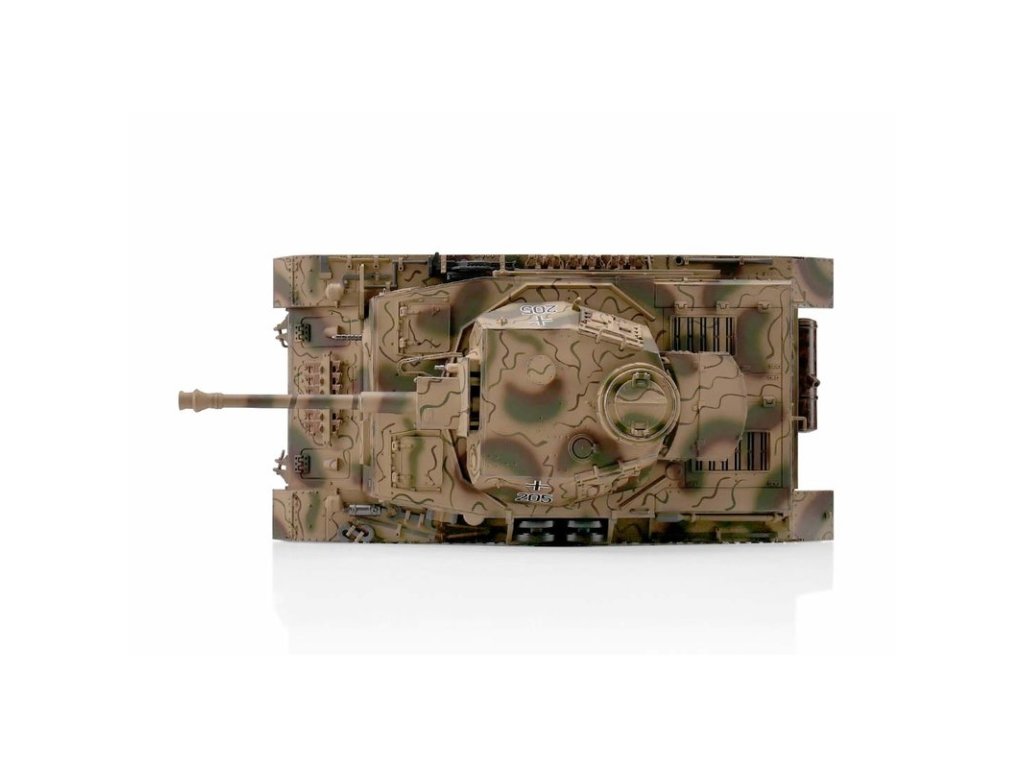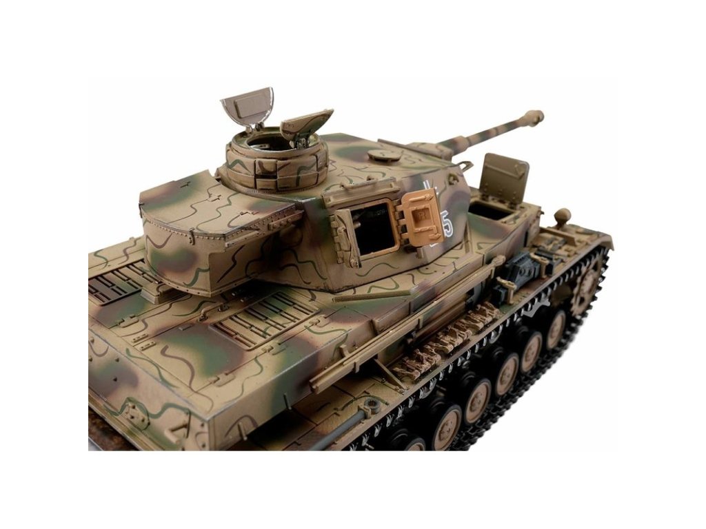 Výkonný model tanku má RC ovládání 2,4 GHz. Vozidlo je vybaveno IR bitevním systémem, takže jsou možné bitvy s vozidly ze stejné série. Motory s optimalizovaným točivým momentem dodávají modelu PzKpfw IV Ausf. G kamufláž přesnou a plynulou jízdu. Kovové převody s robustními převody a vylepšeným převodem zajišťují větší výkon. Díky proporcionálnímu ovládání se můžete s tankem přiblížit velmi pomalu a plynule zvyšovat rychlost. PzKpfw IV Ausf. G kamufláž se pohybuje dopředu a dozadu, také s otočením doleva a doprava. Lze jej také na místě otočit doleva nebo doprava. Můžete zvednout a spustit dělo a otočit věž o 360 stupňů. Realistický zážitek završují různé zvuky motoru, zpětný zákluz hlavně, záblesk hlavně a kouř z výfuku.
