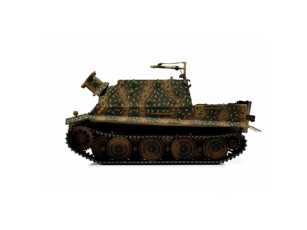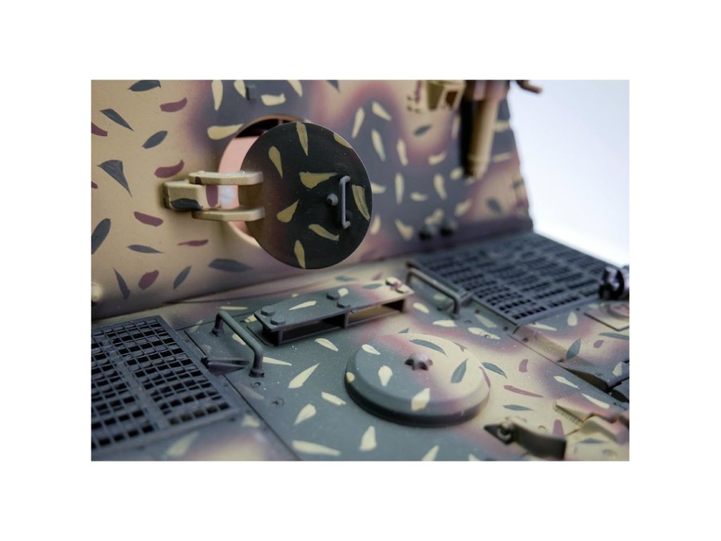 S hmotností kolem pěti kilogramů je Sturmtiger kamufláž ideální pro náročného zákazníka. V profesionální edici se vyznačuje vynikající kvalitou barvy airbrush, technologií desek plošných spojů 2,4 GHz a novým reproduktorem. Tento model má vynikající jízdní vlastnosti, širokou škálu funkcí a realistický zvuk. Vysoce kvalitní pásy, hnací a vodicí kola s válečky, stejně jako spodní část trupu a bojová věž jsou vyrobeny z kovu. Mnoho malých dílů a různých samolepek dokonale završuje repliku věrného měřítka.