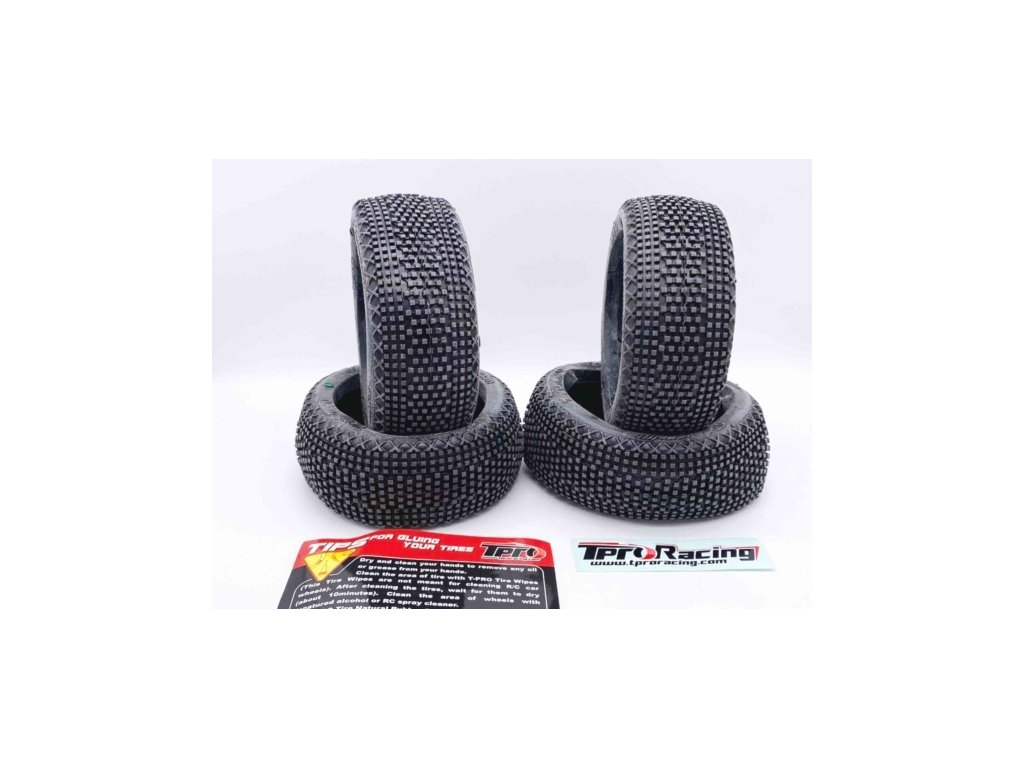 Naše pneumatiky TPRO jsou k dispozici ve 2 různých typech. Jednak jako nelepené pneumatiky v sadě po 4 kusech, nebo jako hotové lepené pneumatiky v páru po 2 kusech. U lepených kol se používá naše modrá vložka TPRO ve střední barvě (TP1309I3) a bílé disky v měkké verzi (TP100011SWH).