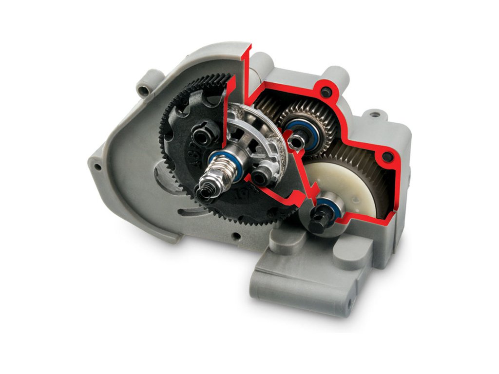 Převodovka, disková spojka a planetový diferenciál jsou uzavřeny do jednoho kompaktního celku. Převodovka s třecí spojkou spolehlivě přenáší výkon motoru na nápravy, planetová převodovka diferenciálu Magnum 272™ má ozubená kola vyrobená z kalené oceli. Tento systém vyžaduje naprosto minimální údržbu. K dispozici jsou pastorky a ozubená kola s různými počty zubů, takže si můžete model přesně vyladit pro rychlostní i technické tratě.