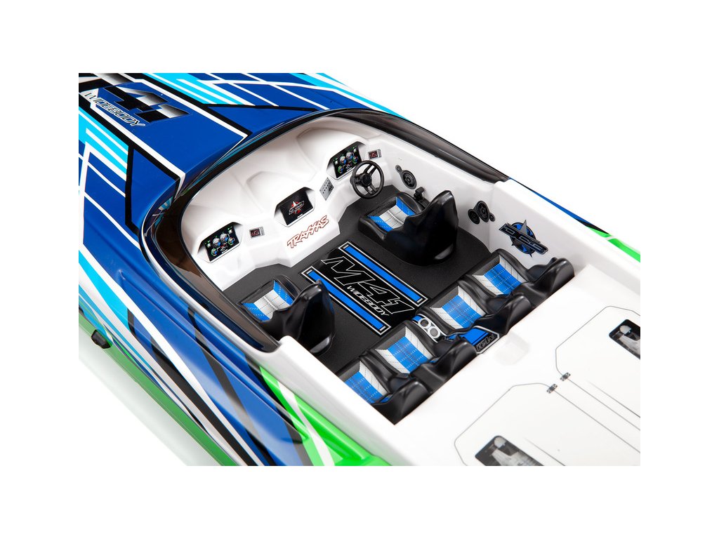 Výkonná RC loď na dálkové ovládání Traxxas DCB M41 věrně reprodukuje tvar kokpitu, s důrazem na detaily, jako jsou ukazatele na palubní desce, reproduktory, volant, sedačky a další. Výborně zpracovaný kokpit koresponduje se vzhledem celé lodi a vytváří tak umělecké dílo se srdcem démona.