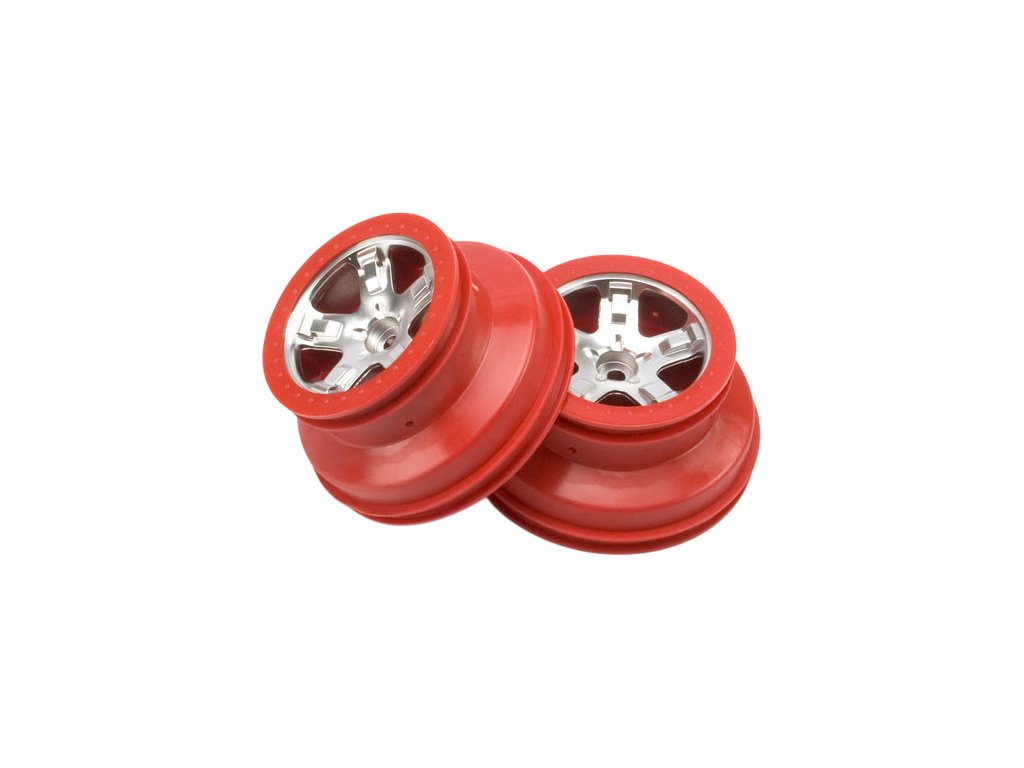 Disky kol 2WD přední SCT chromově matné s červeným ráfkem. Duální průměr disku 2.2/3.0", šířka 41mm. Pro auta Traxxas Slash 2WD. Šestihran 12mm.