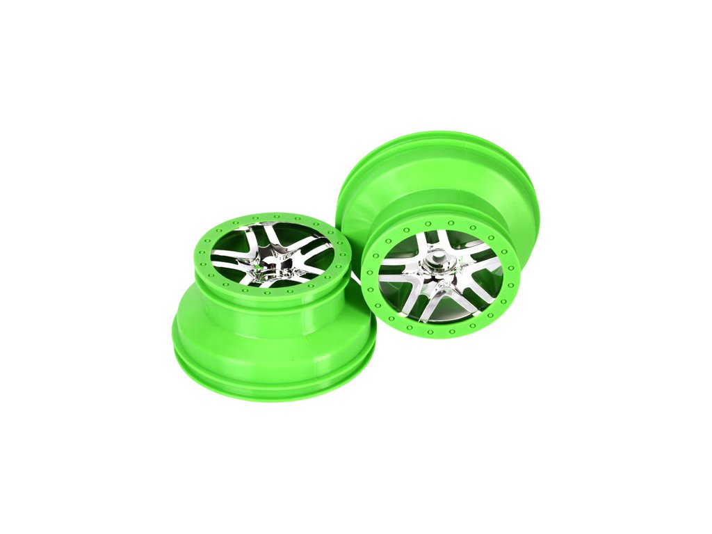 Disky kol 2WD zadní, 4WD přední/zadní SCT Split Spoke chromově lesklé se zeleným ráfkem. Průměr disku 56/76 mm (2.2/3.0"), šířka 41 mm. Pro auta Traxxas Slayer 3.3. Šestihran 12 mm.