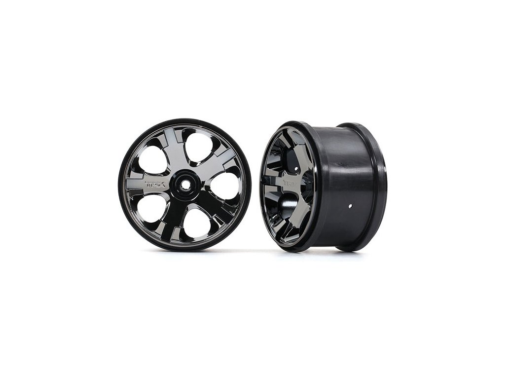 Disky kol nitro zadní, elekro přední All Star chromově černé. Průměr disku 71mm (2.8"), šířka 48mm. Pro auta Traxxas Rustler, Stampede, Sport SE, Jato, Monster Jam. Šestihran 12mm.
