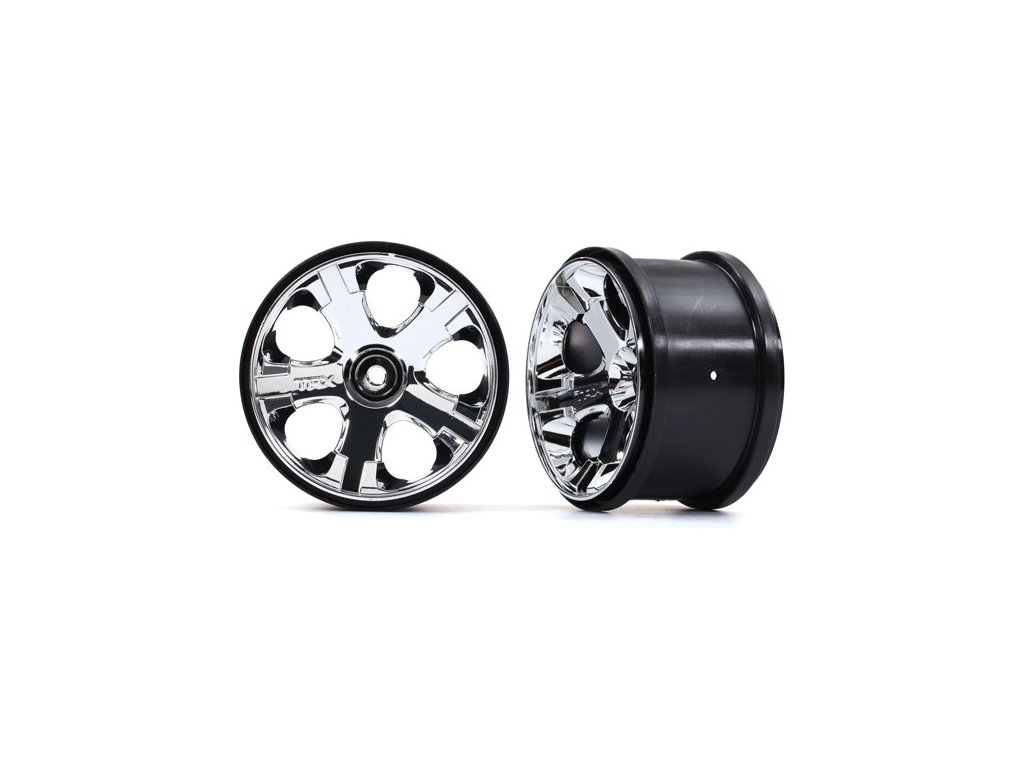 Disky kol nitro zadní, elektro přední All Star chromově lesklé. Průměr disku 71mm (2.8"), šířka 48mm. Pro auta Traxxas Rustler, Stampede, Sport SE, Jato, Monster Jam. Šestihran 12 mm.